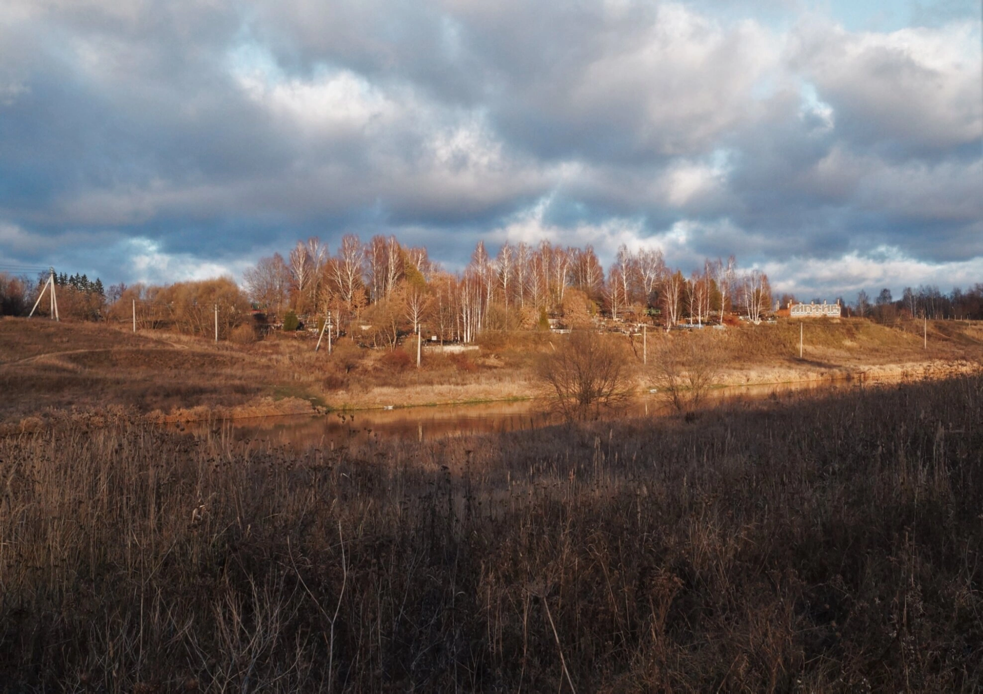 Окружающий пейзаж передаёт умиротворённую атмосферу осеннего дня. Пожухлая трава и кустарники на переднем плане свидетельствуют о наступлении осенней поры, когда природа готовится к зимнему сну. Облачное небо создаёт мягкое освещение, подчёркивая благостное настроение этого святого места.