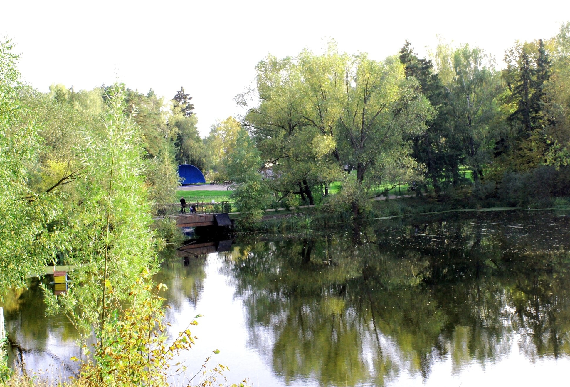 Осенняя природа окружает храм разноцветьем красок: золотистые и багряные оттенки лиственных деревьев сочетаются с темной зеленью хвойных пород. На переднем плане видны ветви деревьев с пожелтевшей листвой, обрамляющие композицию и создающие эффект присутствия. Вдали, за мостом, просматривается синее строение, возможно, беседка или часовня, дополняющая архитектурный ансамбль.