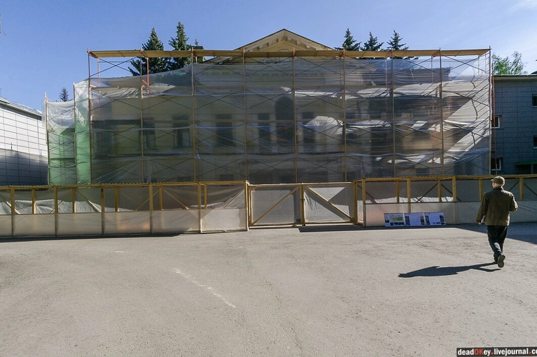 Двухэтажное церковное здание, возведённое в классическом стиле православного зодчества, временно укрыто защитной зелёной сеткой, сквозь которую просматриваются лишь отдельные элементы фасада. Перед храмом установлено временное ограждение, отделяющее территорию проведения восстановительных работ от остальной площади.