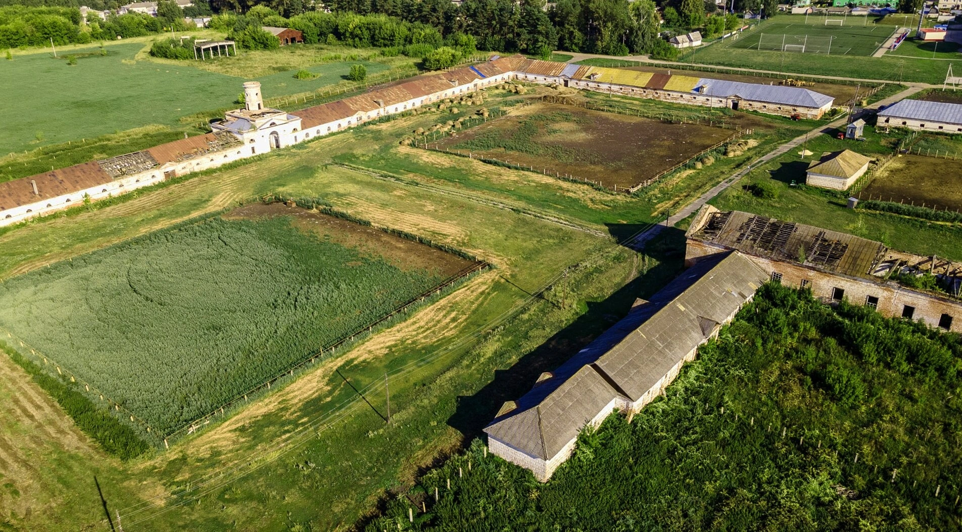 Территория вокруг архитектурного комплекса представляет собой сочетание участков с естественным травяным покровом и огороженных загонов, что свидетельствует о сельскохозяйственном назначении этих земель в прошлом. Общий вид сверху позволяет оценить масштаб исторического комплекса и его гармоничное вписывание в природный ландшафт. Несмотря на аварийное состояние большинства строений, фотография передает былое величие этого духовного и хозяйственного центра нижегородской земли.