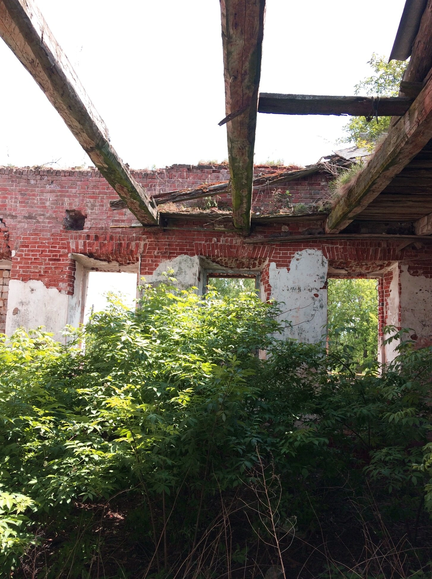 На переднем плане доминируют две массивные колонны, сложенные из кирпича и некогда покрытые штукатуркой. Их поверхность, осыпавшаяся в результате длительного запустения и воздействия стихий, демонстрирует глубокие следы разрушения. Между колоннами просматривается фрагмент фасада с оконным проёмом, закрытым защитной решёткой, который также находится в аварийном состоянии.