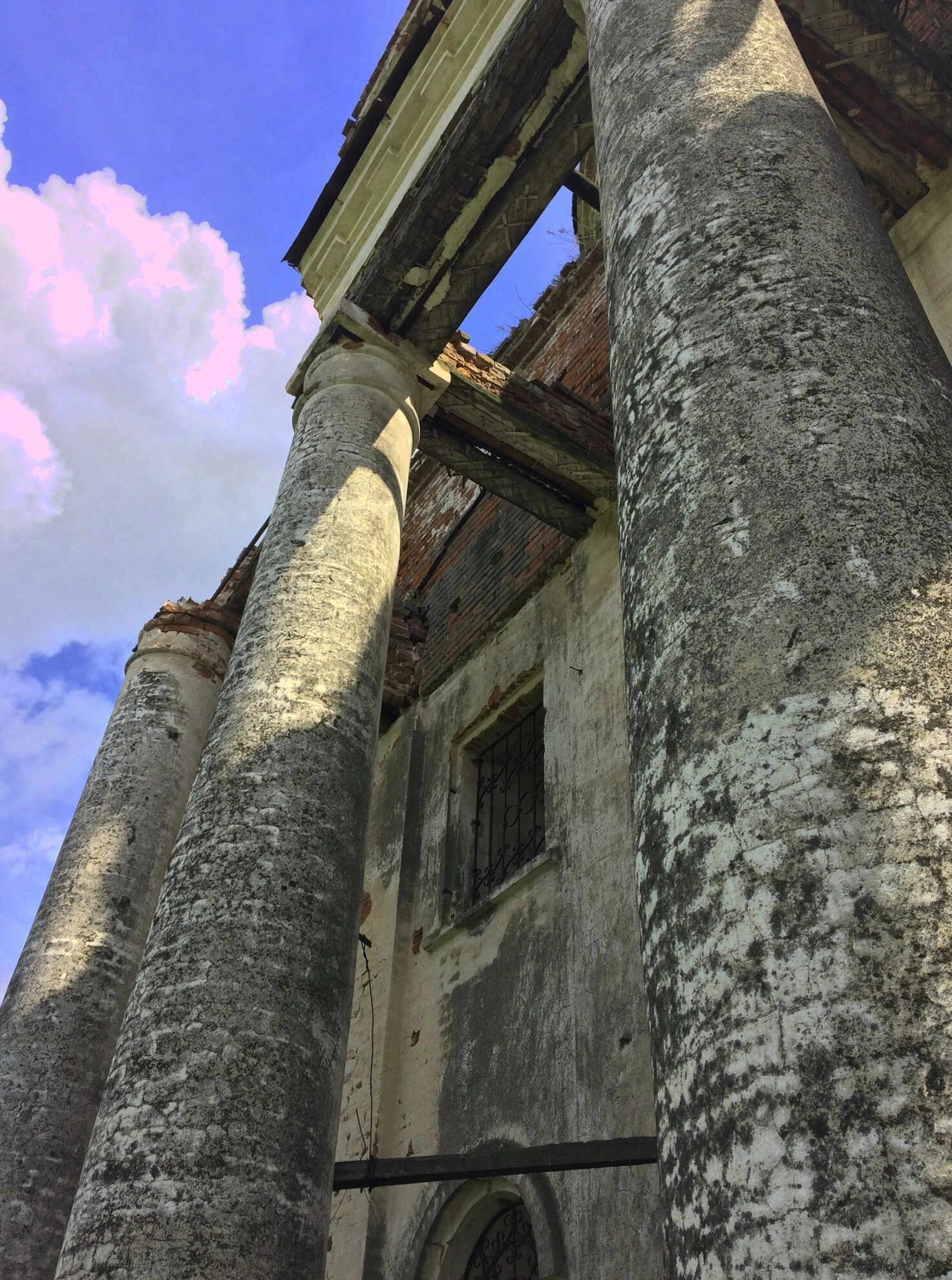 На переднем плане доминируют две массивные колонны, сложенные из кирпича и некогда покрытые штукатуркой. Поверхность их сильно повреждена: штукатурный слой осыпался, обнажая кладку и оставляя красноречивые свидетельства долгих лет запустения. Эти колонны, уцелевшие вопреки времени, продолжают нести на себе элементы разрушенного антаблемента.