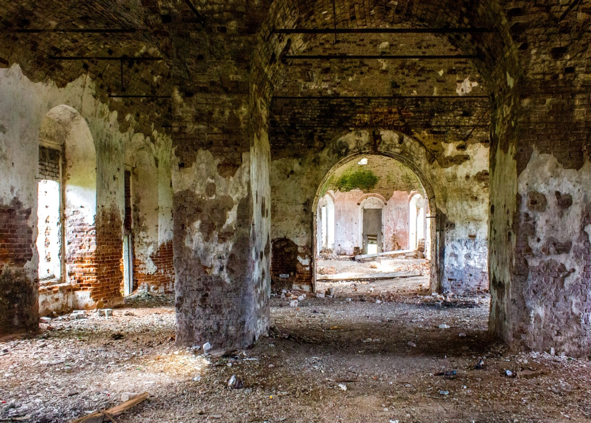 Внутреннее пространство, представшее на снимке, являет собой большой зал, где некогда совершались богослужения. Архитектурную основу интерьера составляют массивные колонны и арочные проемы, характерные для церковного зодчества того времени. Естественный свет проникает внутрь через высокие оконные проемы без стекол, освещая открытую кирпичную кладку стен, с которых местами осыпался слой штукатурки. Пол храма покрыт слоем земли и строительного мусора, а на сводах и арках заметны следы прорастающей растительности, что указывает на длительное воздействие влаги и перепадов температур.
