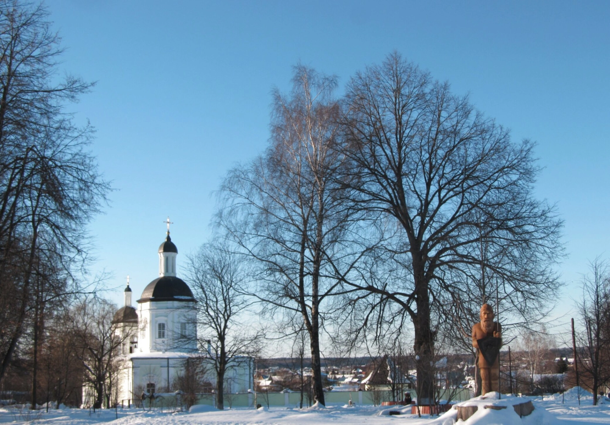 Архитектурный облик храма характеризуется строгими пропорциями и завершается тёмным куполом, увенчанным православным крестом, устремлённым ввысь к ясному голубому небу. На переднем плане фотографии виднеются заснеженные берёзы, являющиеся неотъемлемой частью русского пейзажа и создающие особую лирическую атмосферу. Справа от церковного строения располагается памятник, дополняющий исторический вид данной местности.