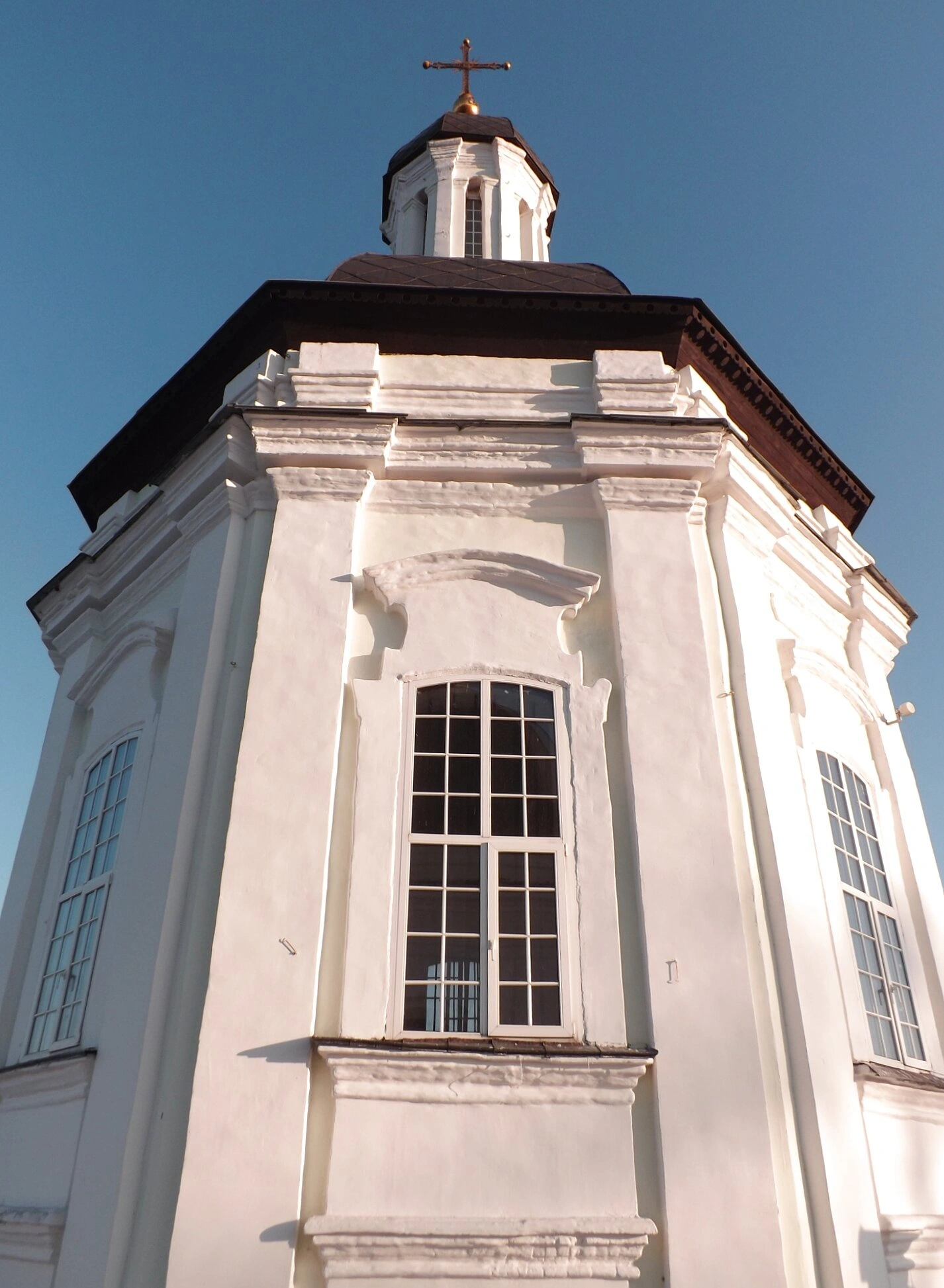 Архитектура храма представляет собой редкий образец раннего петровского барокко, для которого характерны сдержанность декора и сохранение традиционных объёмно-пространственных решений. На снимке хорошо просматриваются характерные элементы стиля: строгие пилястры, изящные наличники окон, лаконичный карнизный пояс. Фасад здания отличается благородной простотой и гармонией пропорций.