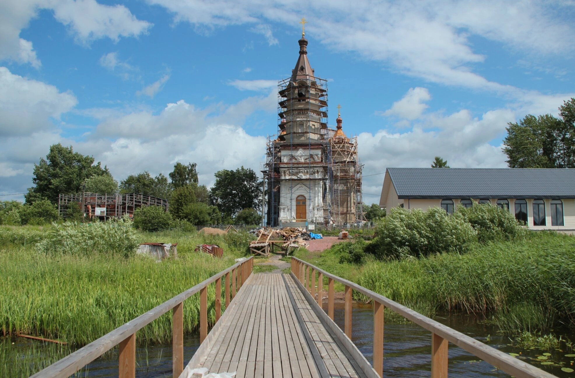 На представленной фотографии запечатлена Церковь Троицы Живоначальной, расположенная в селе Иссад Волховского района Ленинградской области. Храм возвышается на живописном берегу водоёма, а путь к его святым вратам лежит через аутентичный деревянный мост, который гармонично вписывается в окружающий пейзаж.