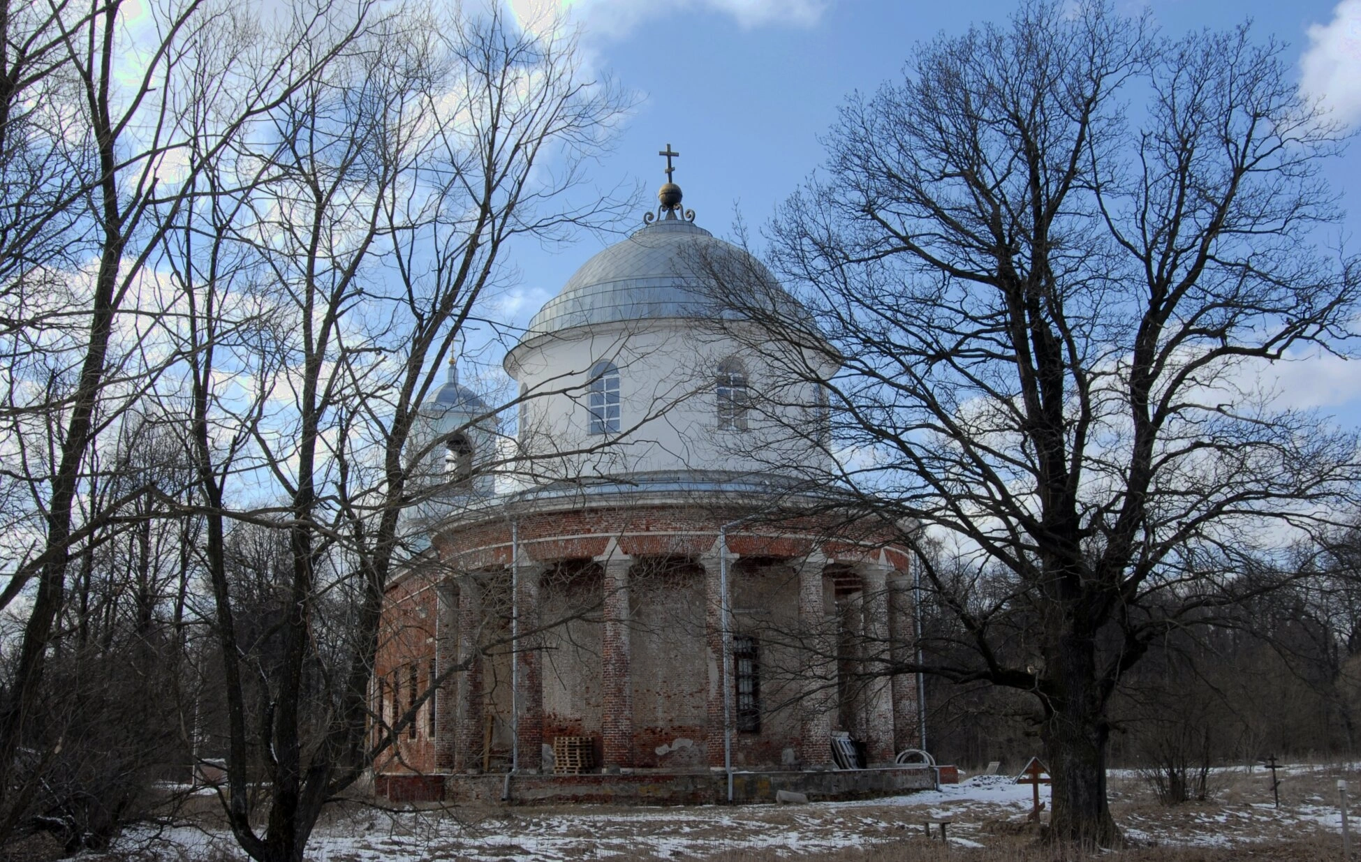 По периметру здания расположены арочные проёмы и колонны, что создаёт ощущение величия и лёгкости одновременно. На снимке видно, что святыня переживает непростой период: местами обветшала кирпичная кладка, отсутствуют оконные заполнения. Окружающий пейзаж с голыми деревьями и снегом с проталинами указывает на съёмку в межсезонье, подчёркивая заброшенность и необходимость срочных реставрационных работ.