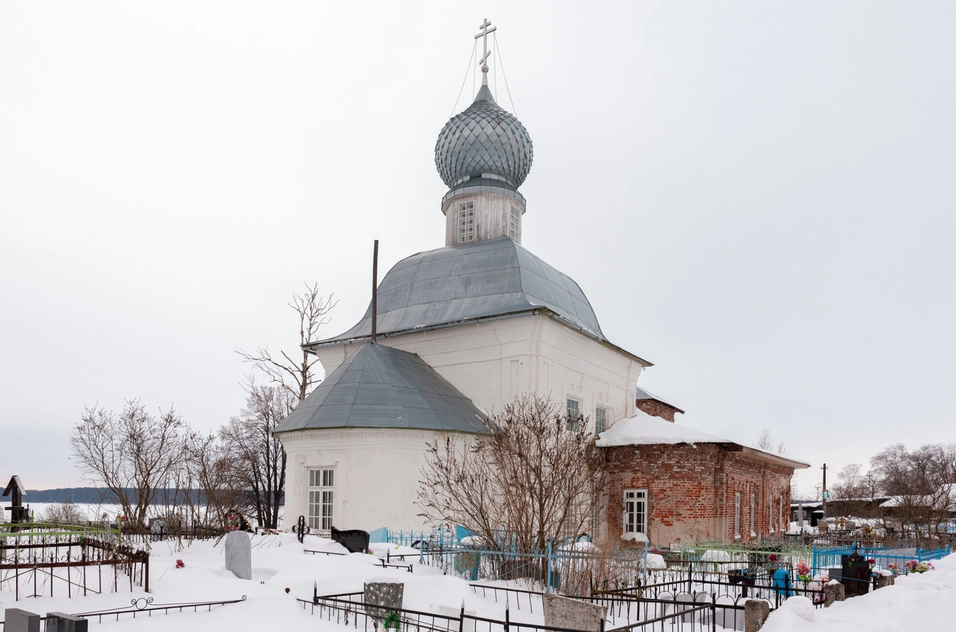 На переднем плане фотографии виден церковный двор, покрытый чистым снегом, и старинное кладбище, где нашли упокоение многие поколения местных жителей. Снежное покрывало придаёт всему пейзажу особую благоговейную тишину и чистоту, подчёркивая умиротворённость и святость этого места. Строгие формы храма, его светлые стены и тёмные кровли создают выразительный силуэт на фоне зимнего неба.