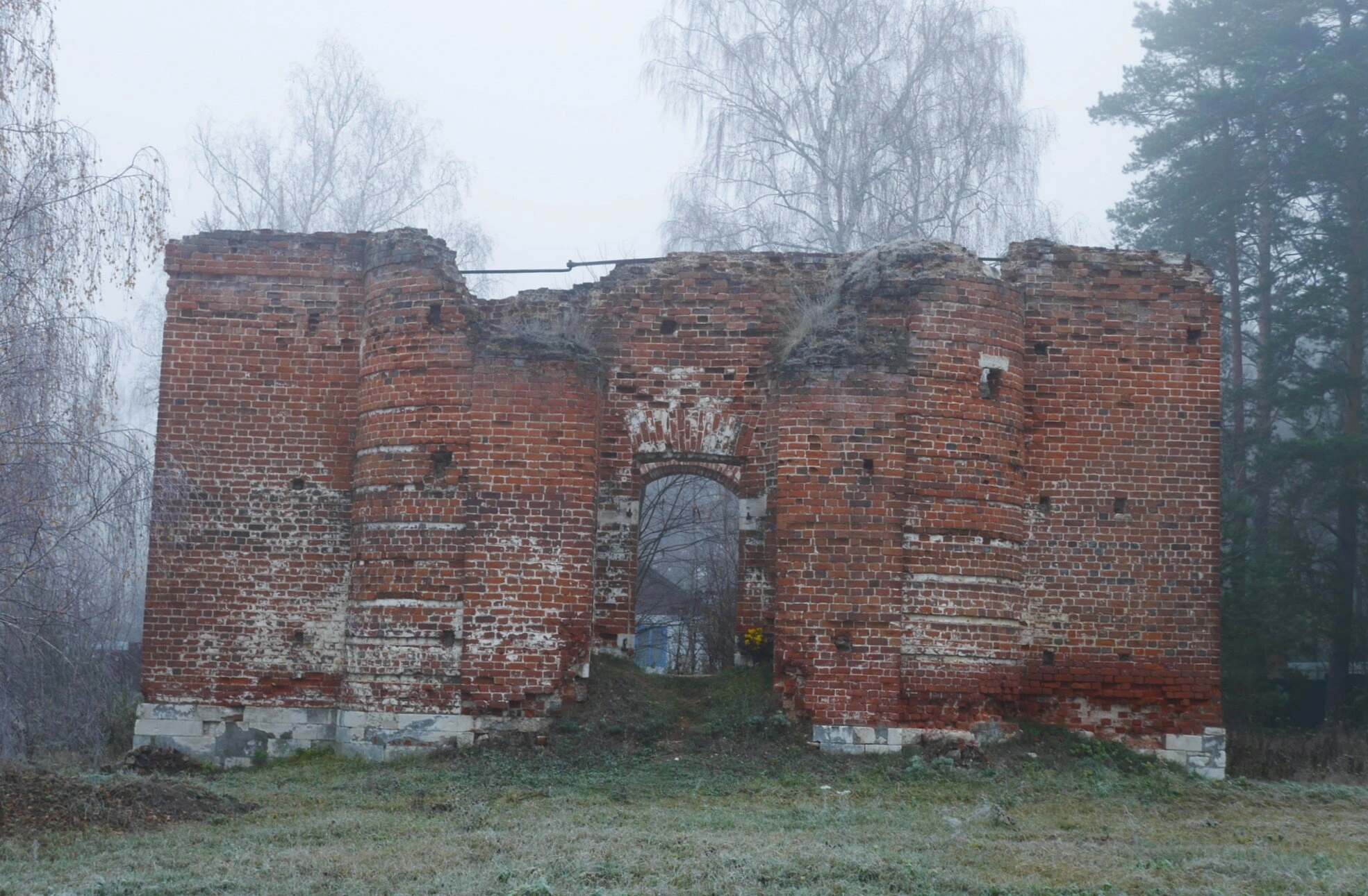 На фотографии запечатлены сохранившиеся фрагменты стен Троицкого храма в селе Лужники Ступинского района Московской области. Это кирпичная однокупольная церковь, построенная в стиле ампир с трапезной и колокольней. Сооружение представляет собой памятник православной архитектуры, переживший период запустения и разрушения.