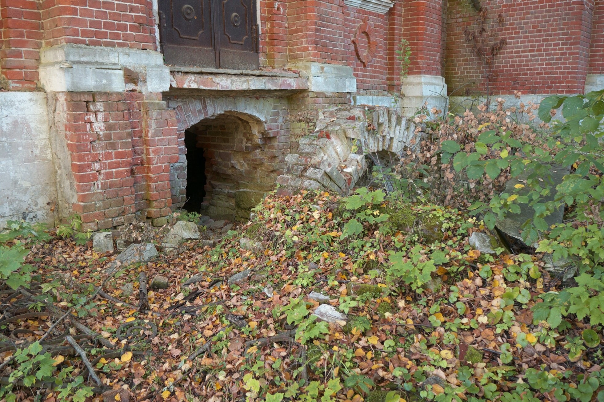 На представленной фотографии запечатлена Церковь Троицы Живоначальной, расположенная в селе Лужники Ступинского района Московской области. Снимок демонстрирует часть разрушенного кирпичного здания, предположительно одного из приделов или церковного подвала. Строение сильно пострадало от времени и человеческого равнодушия, его стены частично скрыты под покровом растительности. Опавшие листья вокруг свидетельствуют об осеннем периоде, когда была сделана фотография.