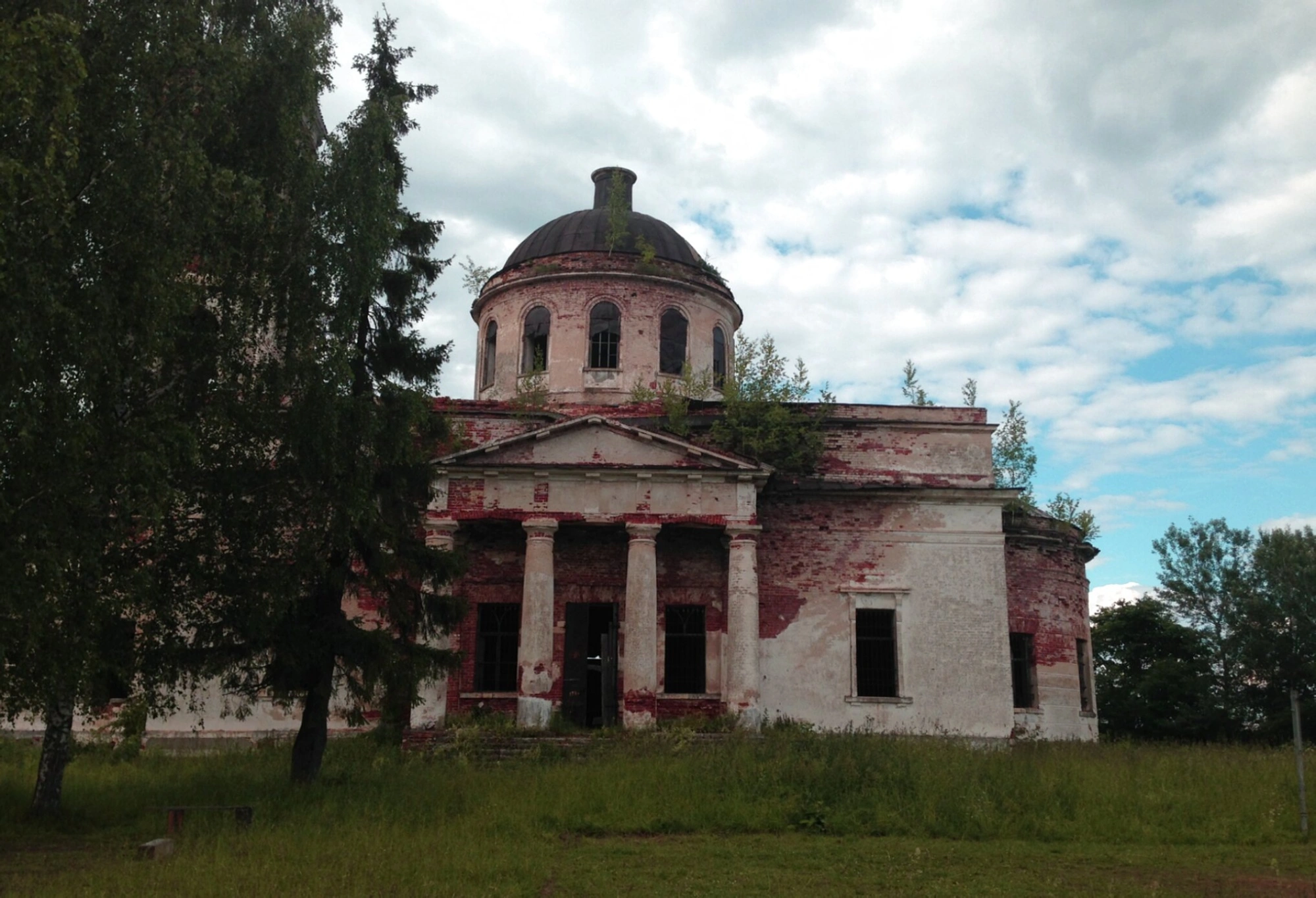 К великому сожалению, время и запустение не пощадили святыню. На фотографии явственно видны следы разрушения: местами обвалившаяся штукатурка, обнажившая кирпичную кладку стен и сводов. Сквозь кровлю и разрушения купола пробивается растительность, что лишний раз подчеркивает долгие годы забвения. Храм стоит на открытой местности, окруженный полем и немногочисленными деревьями — елями и берёзами, под хмурым облачным небом, что создаёт атмосферу грустного величия и покинутости.