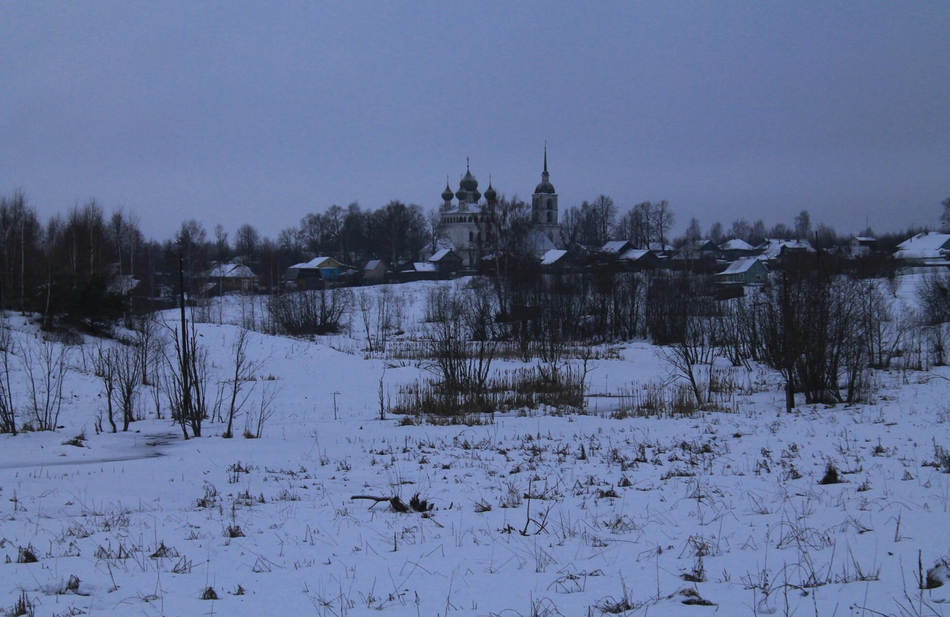 На среднем плане виднеются деревья, лишенные листвы, сквозь которые просматриваются скромные деревенские дома. Эти строения harmoniously вписываются в общую композицию, подчеркивая единство храма и мирской жизни прихожан.