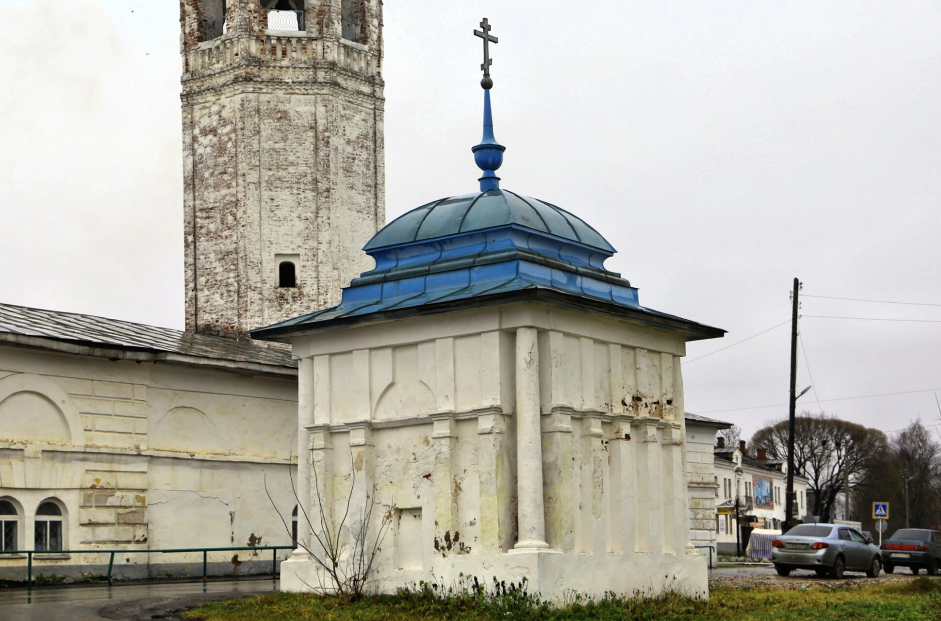 На заднем плане фотографии виднеется мирская жизнь: жилые дома и припаркованные автомобили, что создаёт интересный контраст между духовным и повседневным миром. Церковь Троицы Живоначальной в Письцове является не только действующим приходом, но и важным историко-культурным объектом, привлекающим внимание верующих и ценителей православного наследия России.