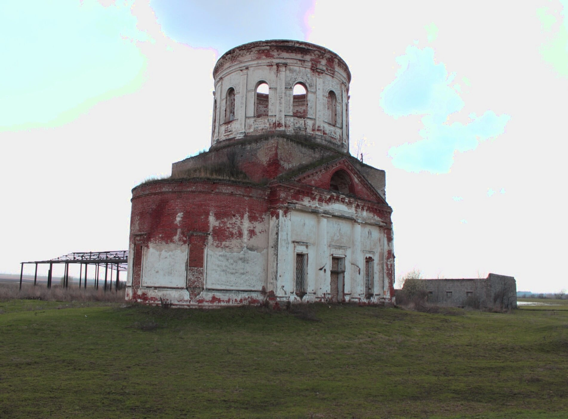 Церковь расположена на возвышенности в окружении полей, что подчёркивает её доминирующее положение в сельском ландшафте. На заднем плане просматриваются остатки металлических конструкций, возможно, свидетельствующие о бывших хозяйственных постройках. Отсутствие людей на фотографии и запустение вокруг создают атмосферу скорби по утраченной святыне.