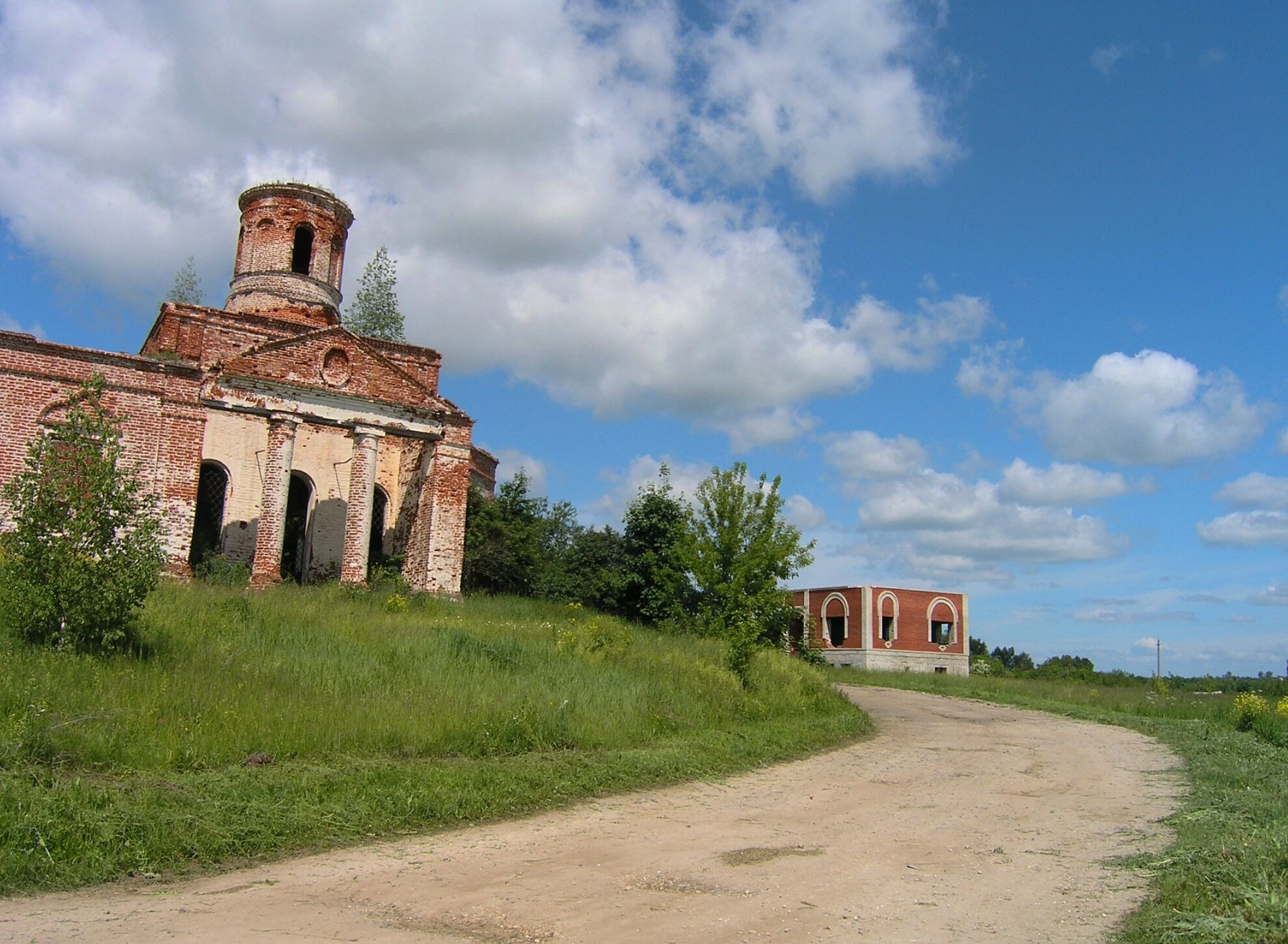 Окружает святыню типичный для среднерусской полосы пейзаж: густая трава, молодые осинки и березы, подступающие к самым стенам, что придает месту особый лирический и одновременно скорбный вид. К храму ведет грунтовая дорога, а на дальнем плане виднеется еще одно кирпичное строение, возможно, бывшее церковно-приходское здание или сторожка.