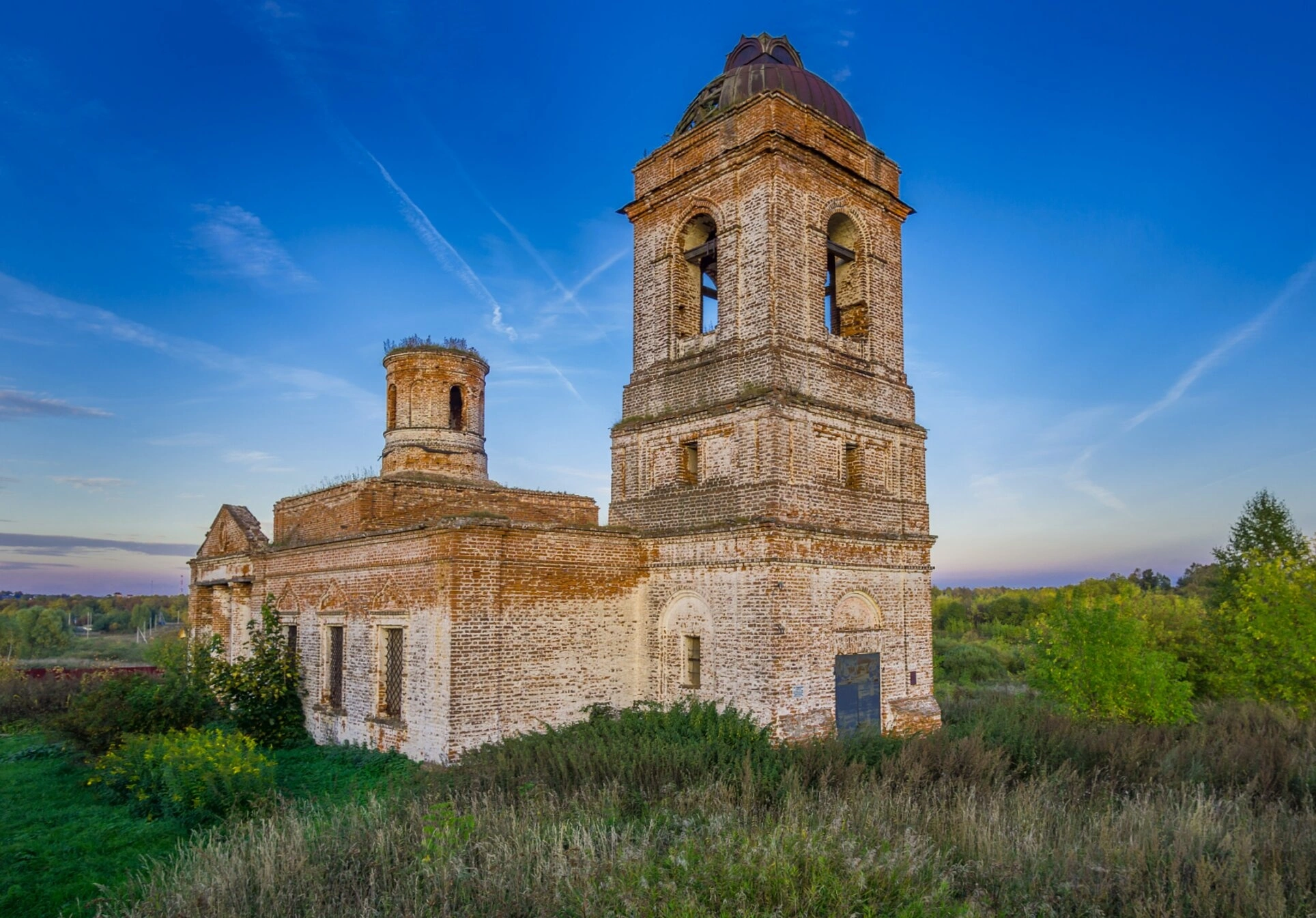 На представленной фотографии запечатлена Церковь Троицы Живоначальной, расположенная в селе Спирино Нижегородской области. Храм находится в заброшенном состоянии, что придает его облику особую атмосферу утраченного величия и духовной памяти.