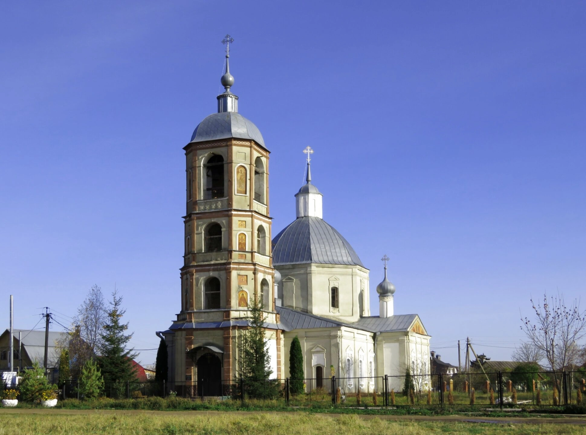 На представленной фотографии запечатлён величественный православный храм — Церковь Троицы Живоначальной, расположенная в старинном селе Троицкое на Калужской земле. Этот храм является ярким образцом русской церковной архитектуры и духовным центром для верующих.