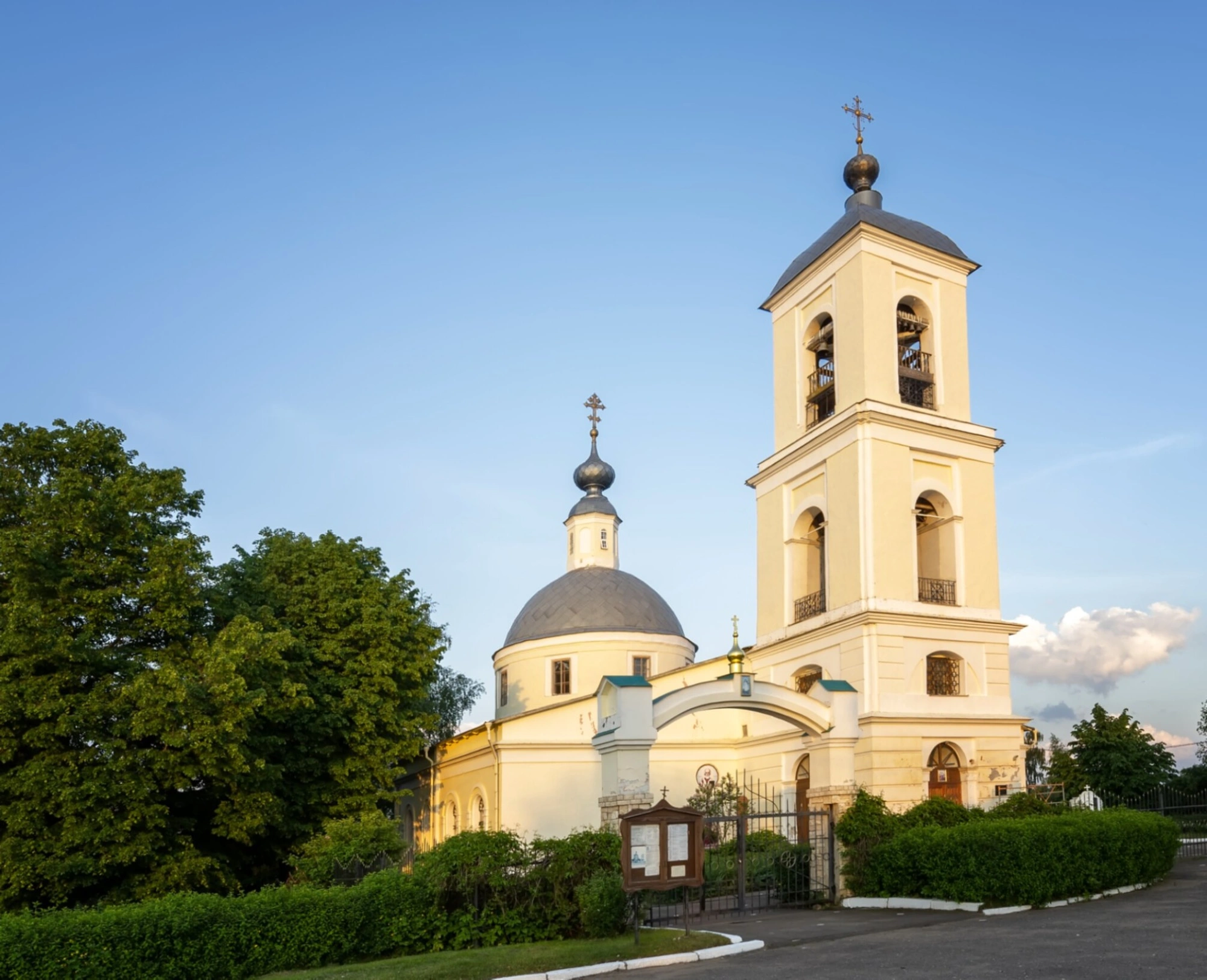 Перед входом в дом Божий расположена арочная калитка с невысоким навесом бирюзового цвета, что добавляет в облик святыни скромную, но выразительную деталь. Территория вокруг храма содержится в образцовом порядке: видны аккуратно подстриженные зелёные кустарники и деревья с пышной кроной. Асфальтированная дорожка на переднем плане ведёт к вратам церковным, приглашая паломников и богомольцев.