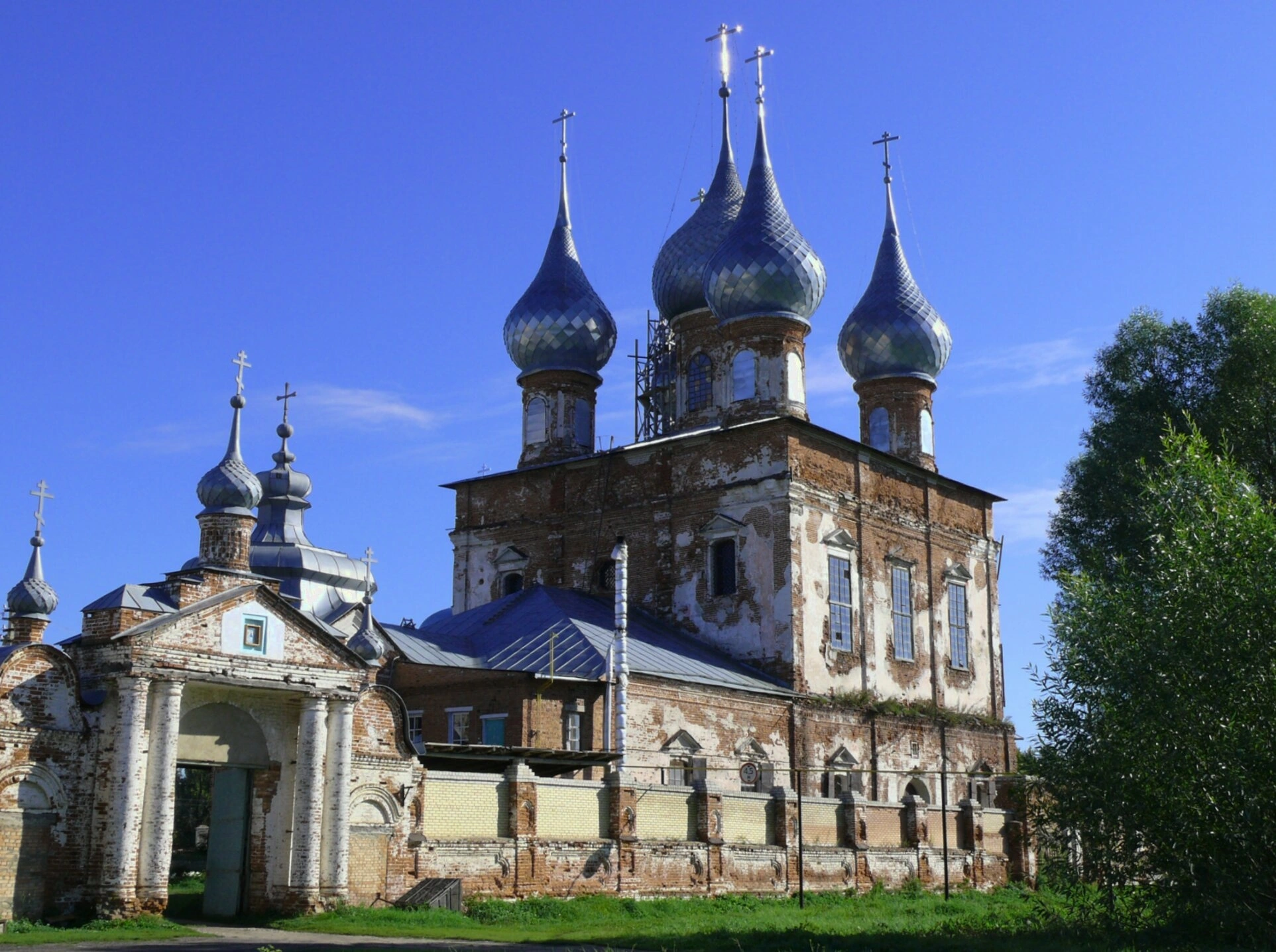 Фотография передаёт благородное величие храма, несущего на себе следы времени. На кирпичных стенах заметны частичные утраты штукатурного слоя, что подчёркивает исторический характер постройки и придаёт ей особую атмосферу духовной стойкости и памяти. Храм располагается на живописном зелёном лугу под высоким голубым небом, а рядом с ним растёт раскидистое дерево с густой кроной, символизируя глубокую связь божьего дома с русской природой.