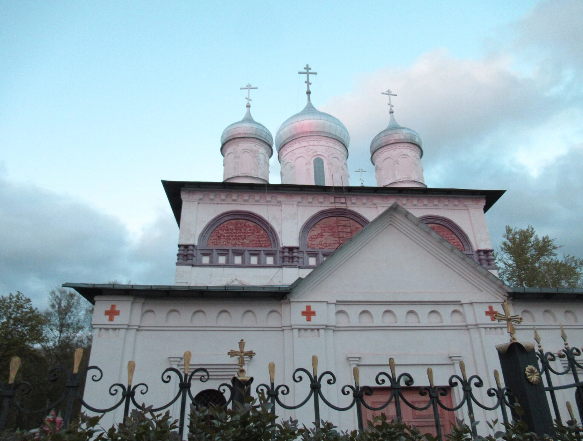 Фасад святыни украшен аркадами и изящными декоративными элементами, характерными для храмового зодчества. На переднем плане фотографии видна ажурная металлическая ограда с коваными крестами, ограждающая церковную территорию. За оградой проглядывает свежая зелень кустарников, подчёркивая ухоженность и благодать этого святого места.