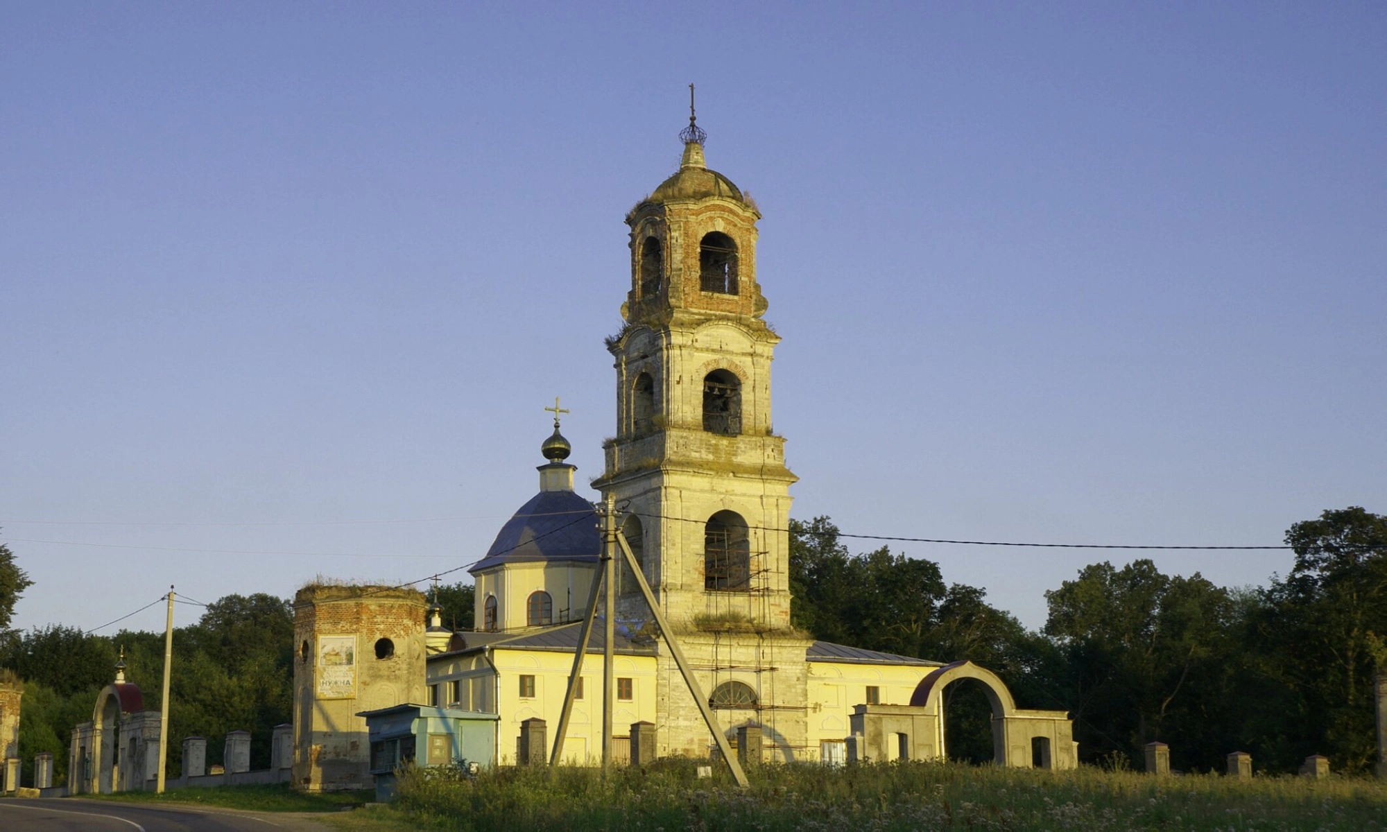 К колокольне примыкает основной объём храма, представляющий собой бесстолпный четверик с двумя одноглавыми приделами. Купол центральной части сохранил свой синий цвет, напоминающий о небесной благодати. С левой стороны от основного здания просматриваются остатки разрушенной кирпичной кладки — свидетельства былых архитектурных комплексов, некогда составлявших единый ансамбль.