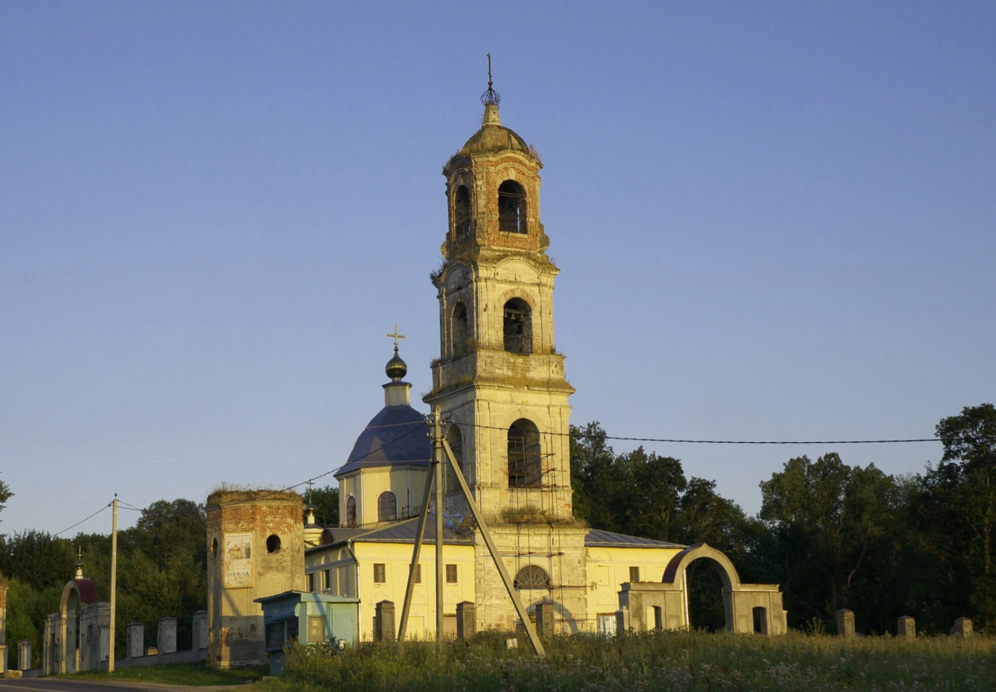Многоярусная колокольня, возвышающаяся рядом с основным зданием, демонстрирует элементы барочного стиля в архитектуре. Фигурные проёмы для колоколов и изящное завершение в виде купола со шпилем придают сооружению особую выразительность. Слева от храма виднеется полуразрушенная кирпичная постройка, вероятно, относящаяся к храмовому комплексу.