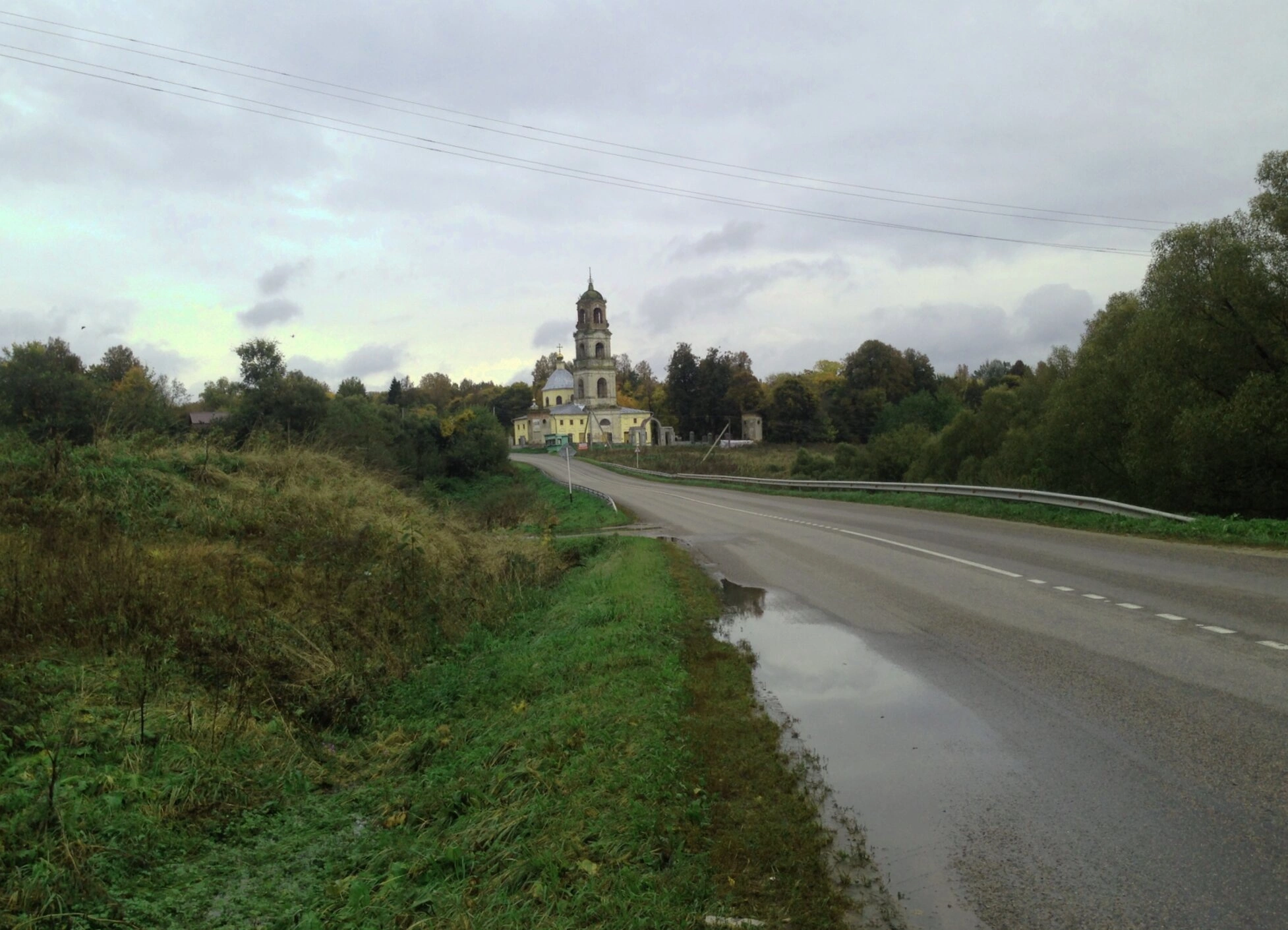 Окружающий пейзаж свидетельствует о осеннем времени года. Дорога, ведущая к храму, отражает недавний дождь, создавая особую атмосферу умиротворения. Деревья, одевшиеся в золотой убор, обрамляют святыню, подчёркивая её духовную значимость в природном ландшафте. Пасмурное небо придаёт снимку особое настроение, характерное для русской осени.