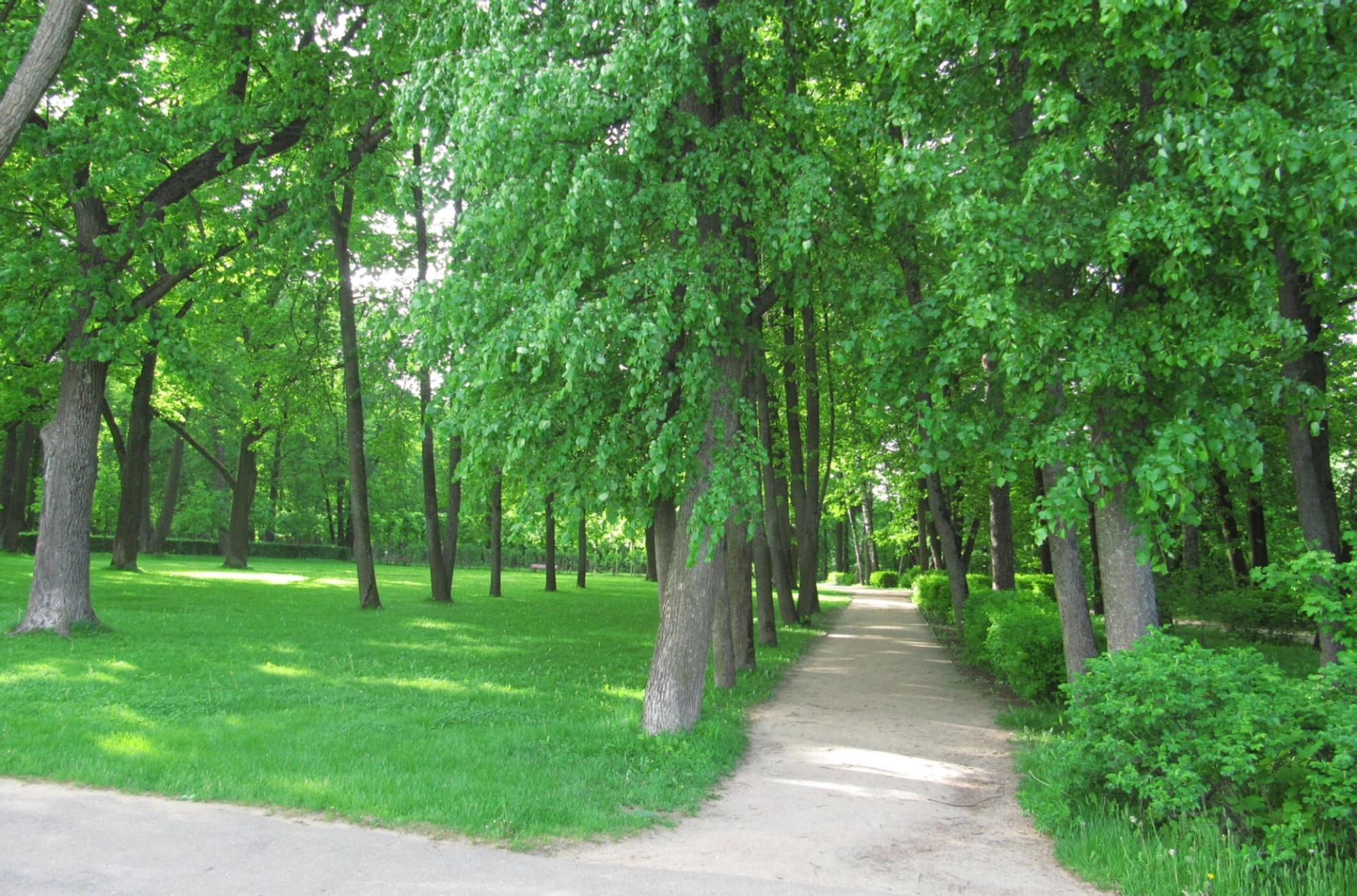 На представленной фотографии запечатлена живописная парковая аллея в усадебном парке Остафьево. В перспективе просматривается величественный храм, посвященный Святой Троице.