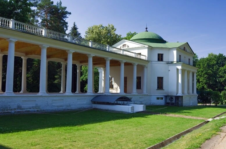 На представленной фотографии запечатлен архитектурный ансамбль музея-усадьбы «Остафьево», известной также как «Русский Парнас». В правой части снимка возвышается восточный флигель усадебного комплекса, увенчанный благолепным зеленым куполом Церкви Троицы Живоначальной.