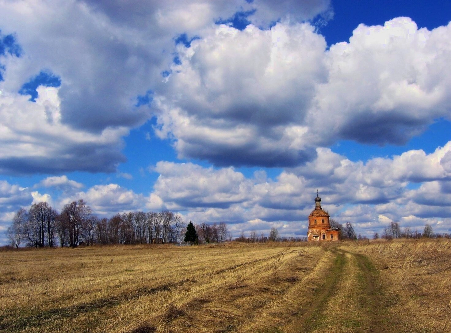 Окружающий пейзаж дополняет образ храма: просторное поле с сухой травой, грунтовая дорога, ведущая к церкви, и деревья без листвы на заднем плане создают атмосферу осеннего умиротворения. Чистое небо с объемными белыми облаками и мягкий солнечный свет подчеркивают текстуру кирпичной кладки и естественные цвета окружающей природы.