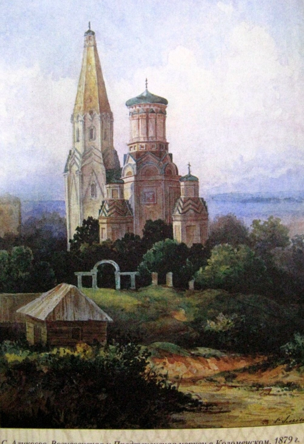 На живописном полотне работы С. Аликосова 1879 года запечатлен величественный архитектурный ансамбль Коломенского, представленный двумя выдающимися храмами XVI столетия. С левой стороны изображена Церковь Вознесения Господня – первый каменный шатровый храм на Руси, возведенный в 1528-1532 годах по велению великого князя Василия III. Этот уникальный памятник архитектуры, ныне включенный в список Всемирного наследия ЮНЕСКО, был построен в честь рождения долгожданного наследника – будущего царя Ивана IV Грозного. Справа на картине представлена Церковь Усекновения Главы Иоанна Предтечи в Дьякове – единственный, помимо собора Василия Блаженного, сохранившийся до наших дней многостолпный храм XVI века. Этот уникальный храмовый комплекс был возведен на правом берегу Москвы-реки, на месте, где Великий князь Василий III получил благую весть о зачатии наследника. Храм представляет собой симметричную группу из пяти восьмигранных столпов, центральный из которых, посвященный Усекновению Главы Иоанна Предтечи, вдвое больше остальных и окружен четырьмя придельными столпами с престолами Зачатия праведной Анны, Зачатия Иоанна Предтечи, Двенадцати апостолов и Московских святителей. Благодаря единству декора и связующей роли галерей сложная архитектурная композиция воспринимается как мощный монолит. Оба храма, являющиеся духовными доминантами Коломенского, свидетельствуют о высочайшем уровне русского зодчества XVI века и продолжают привлекать многочисленных паломников и ценителей православной культуры.