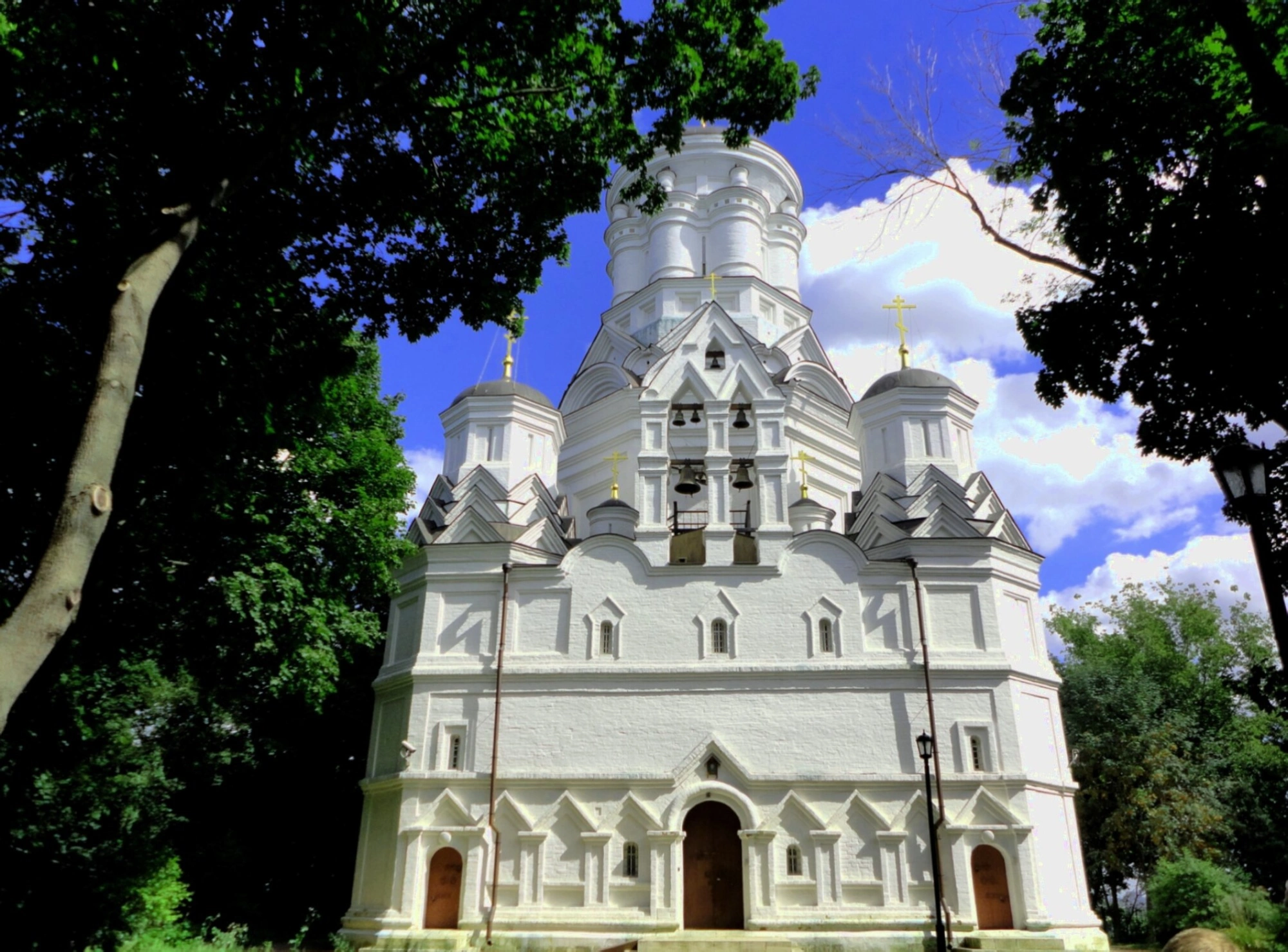 На представленной фотографии запечатлён уникальный памятник русской церковной архитектуры — храм Усекновения Главы Иоанна Предтечи, расположенный в бывшем селе Дьякове на территории музея-заповедника «Коломенское» в Москве. Этот величественный собор, возведённый в середине XVI века, является одним из старейших многопрестольных храмов в России.
