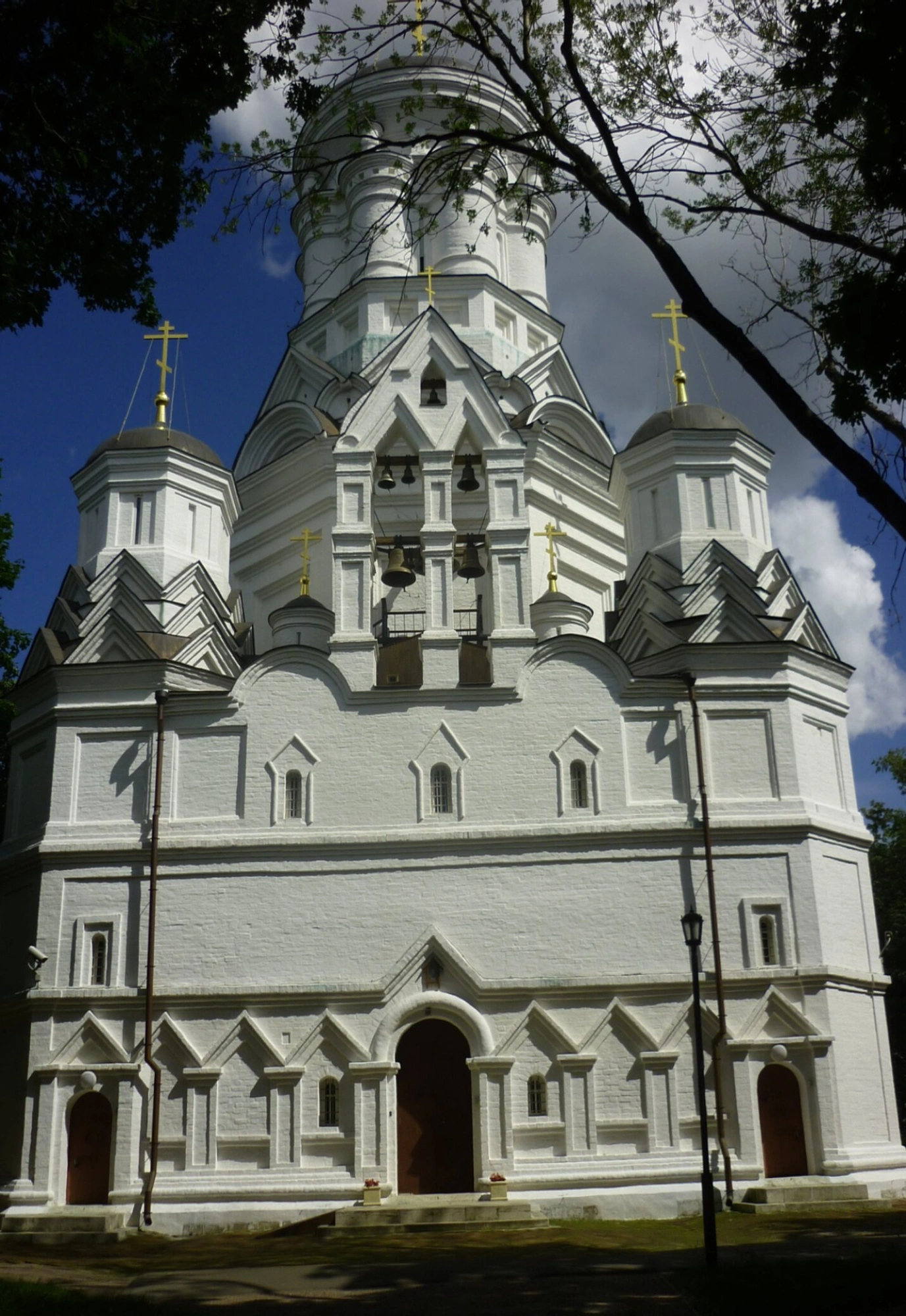 Архитектурный облик храма поистине уникален. Центральный столпообразный объём, увенчанный могучим шатром, окружён четырьмя придельными башнями-столпами, соединёнными между собой арочными галереями. Каждый ярус храма богато украшен филёнками, ложными арками и килевидными кокошниками, которые создают сложную игру света и тени на белых стенах. Венчают приделы изящные шлемовидные главы, водружённые на световые барабаны.
