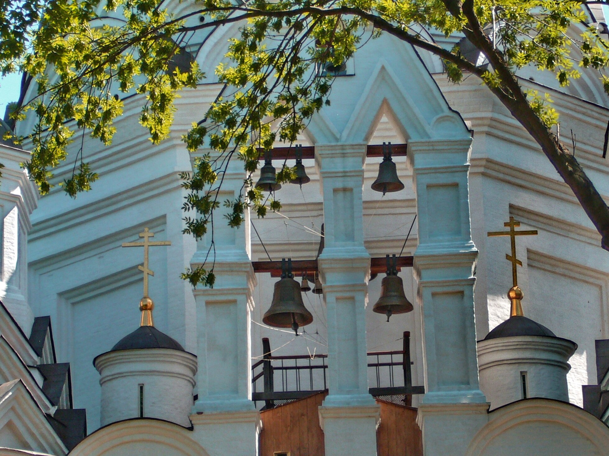 В центре композиции фотографии видна ажурная звонница, между колоннами которой подвешены церковные колокола. По бокам от неё, на переднем плане, сияют на солнце золотые купола, увенчанные православными восьмиконечными крестами. Эти детали подчёркивают сакральное значение храма как места молитвенного предстояния.