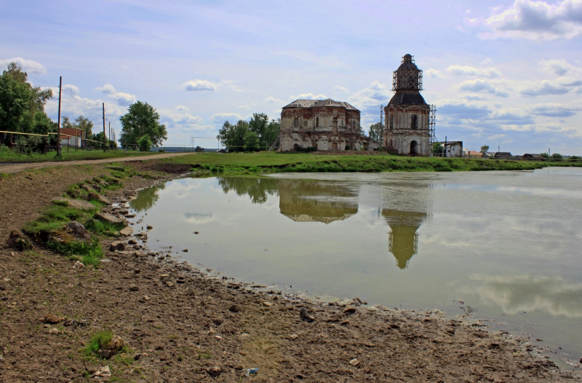 На снимке зафиксирован один из сложных периодов в жизни святыни, когда её стены пребывали в состоянии разрушения. Купол храма обрушился в 2004 году, а само здание долгое время находилось в аварийном состоянии. Видны конструкции, напоминающие строительные леса, что свидетельствует о начале работ по сохранению памятника. Отдельно стоящая колокольня, построенная в 1777 году, является неотъемлемой частью архитектурного ансамбля.
