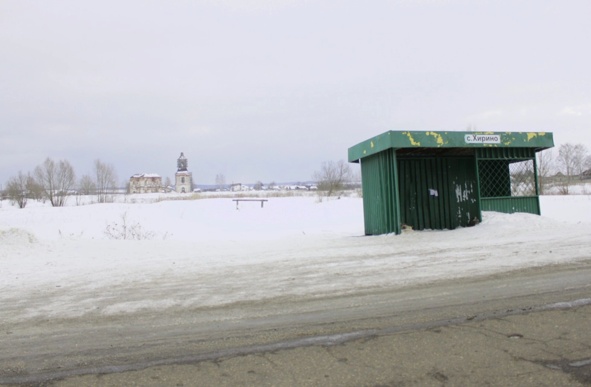 На переднем плане изображена автобусная остановка зеленого цвета с указанием названия села, покрытая слоем снега. Дорога перед остановкой частично расчищена, что свидетельствует о редком, но все же присутствующем транспортном сообщении в этой местности. Далее простирается заснеженное поле, где установлена простая деревянная скамейка, добавляющая камерности композиции.