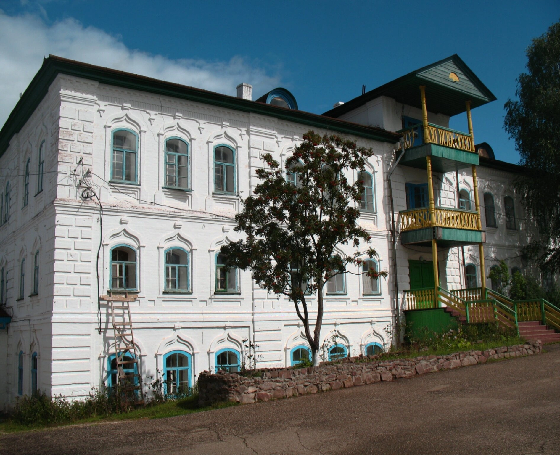 На представленной фотографии запечатлен корпус Троице-Стефано-Ульяновского мужского монастыря, расположенного в селе Ульяново Усть-Куломского района Республики Коми. На снимке изображен двухэтажный белый корпус с зеленой кровлей, являющийся частью архитектурного ансамбля Успенской церкви.