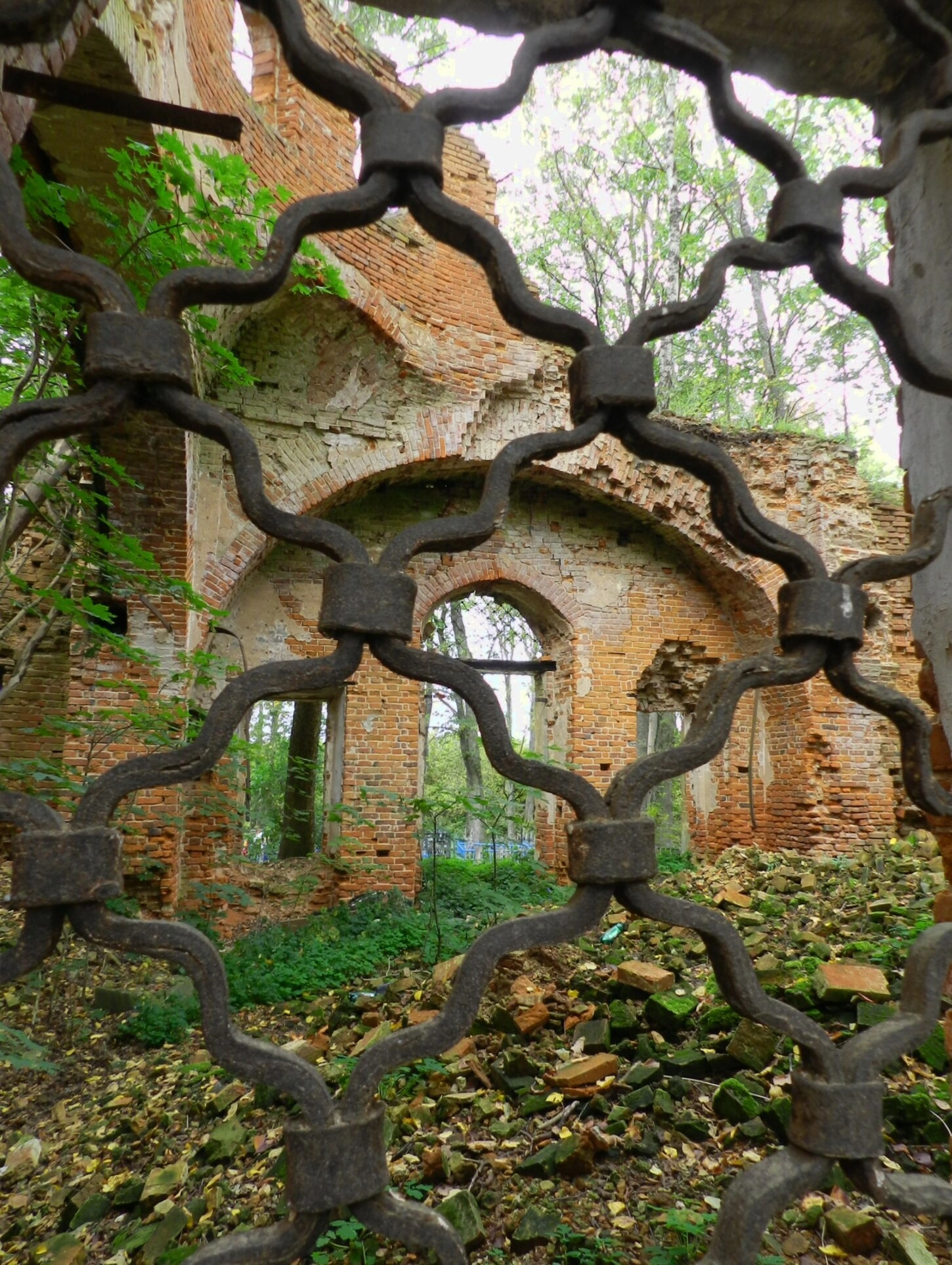 На представленной фотографии запечатлены величественные руины Церкви Успения Пресвятой Богородицы, расположенной на историческом Городище в деревне Выбор. Снимок выполнен через аутентичную кованую решетку с изящным растительным орнаментом, что придает композиции особую глубину и художественную завершенность. Этот архитектурный ракурс позволяет зрителю ощутить себя паломником, взирающим на святыню сквозь пелену времени.