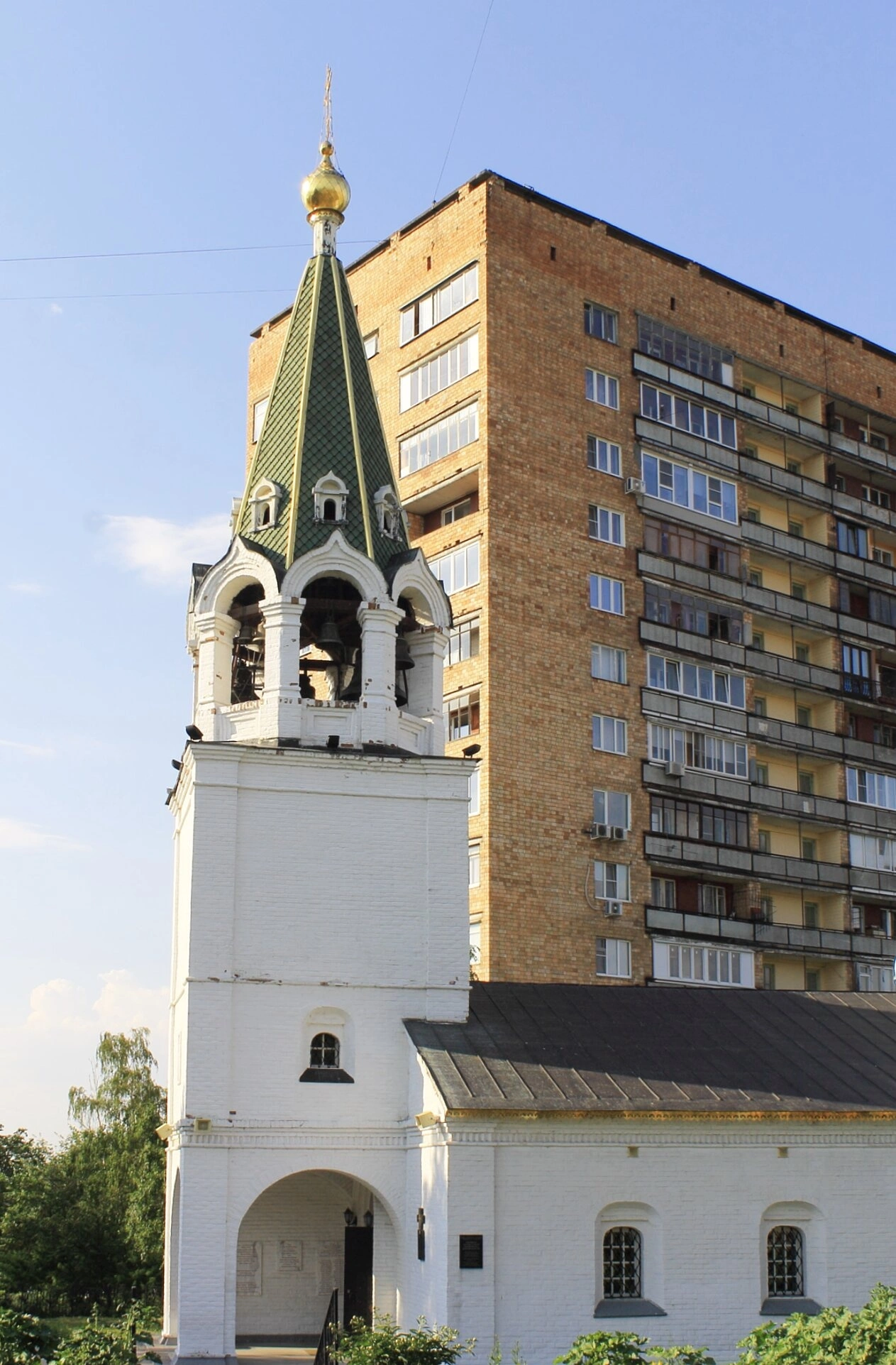 На заднем плане снимка виден контраст эпох: за древней святыней возвышается современное многоэтажное здание. Этот вид символично отражает непрерывность духовной жизни города, где древние традиции православия гармонично сосуществуют с ритмом современного мегаполиса. Голубое небо и кроны деревьев, обрамляющие храм, придают фотографии особую светозарность и спокойствие, подчёркивая благодатную силу этого святого места.