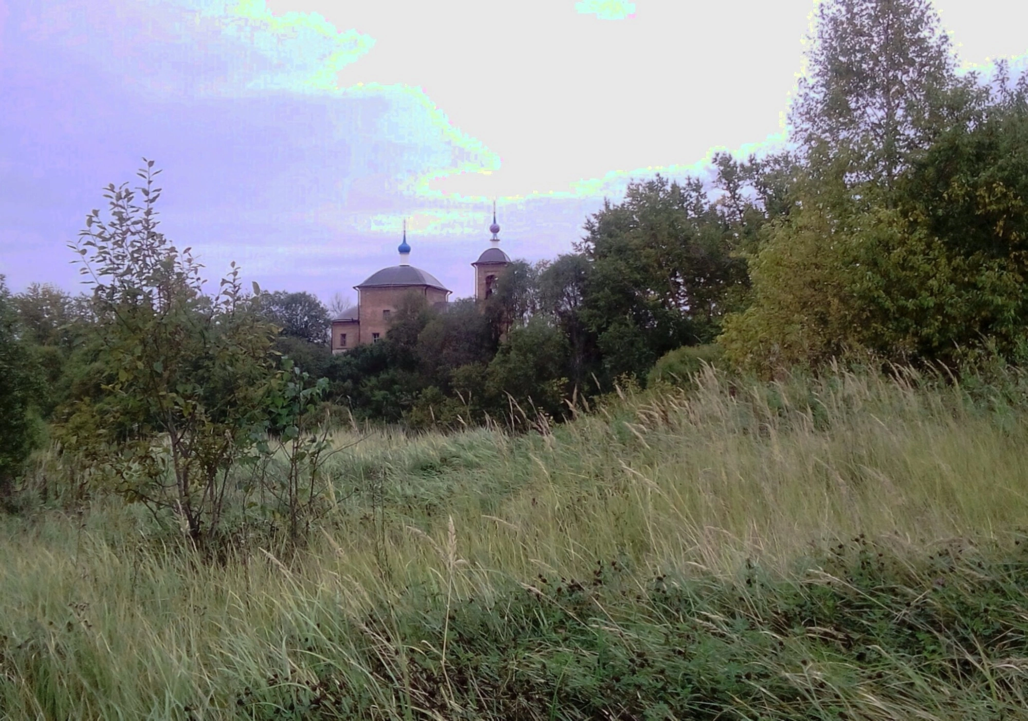 Передний план фотографии занимает поле с высоким разнотравьем, окрашенным в тёплые желтовато-зелёные тона, что указывает на конец лета или начало осени. За ним, на естественном возвышении, величественно возвышается сам храмовый комплекс, окружённый плотным кольцом лиственных деревьев и кустарников. Густая крона деревьев создаёт эффект естественного обрамления и подчёркивает уединённость и гармонию этого святого места с окружающей природой.