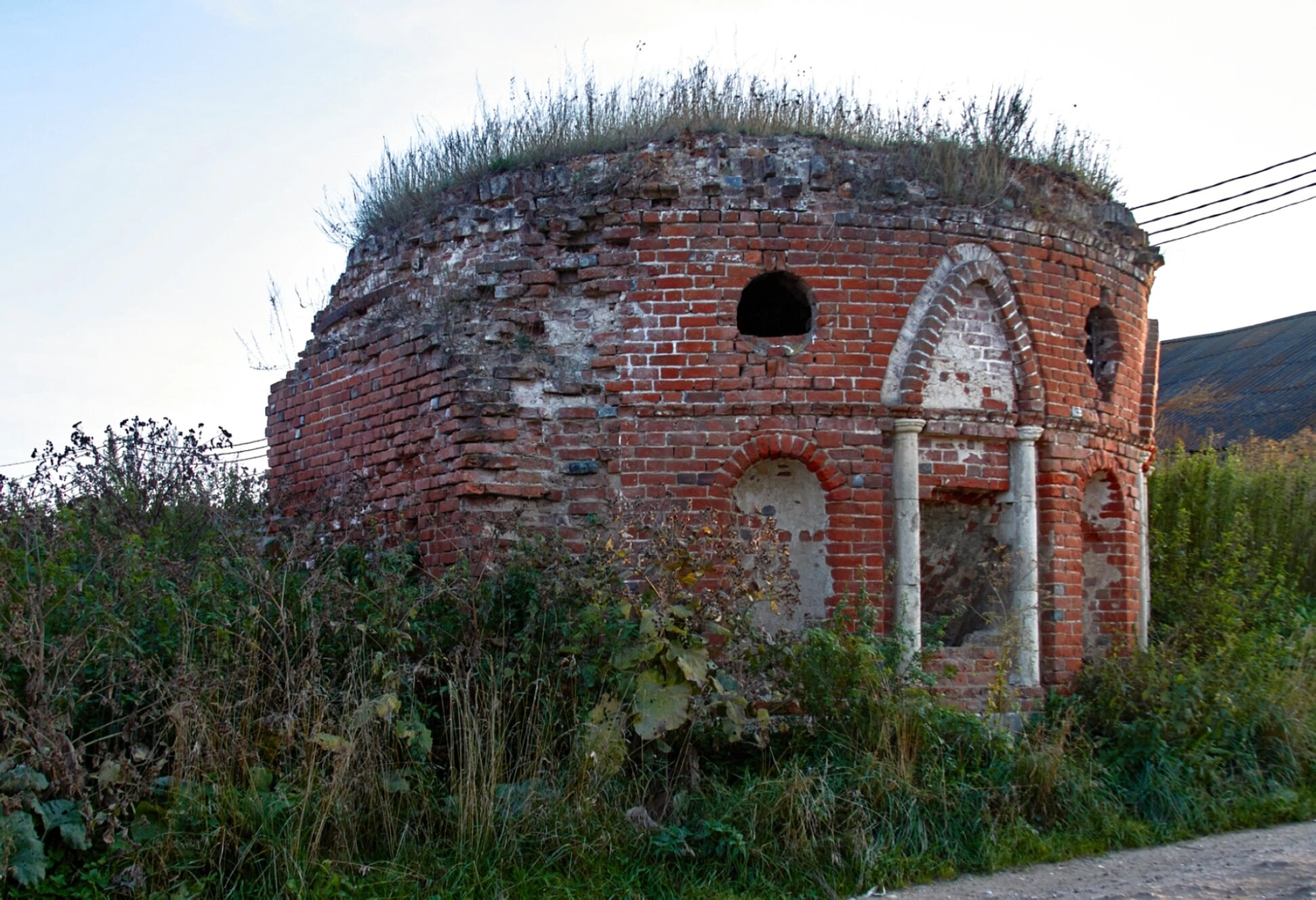 На представленной фотографии запечатлены скорбные руины Церкви Успения Пресвятой Богородицы, расположенной в селе Черкизово Коломенского района Московской области. Святыня, некогда возвышавшаяся над округой, ныне предстаёт в виде фрагментов кирпичных стен, густо поросших дикой растительностью, что символизирует печальное состояние забвения, в котором пребывает этот памятник православной архитектуры.