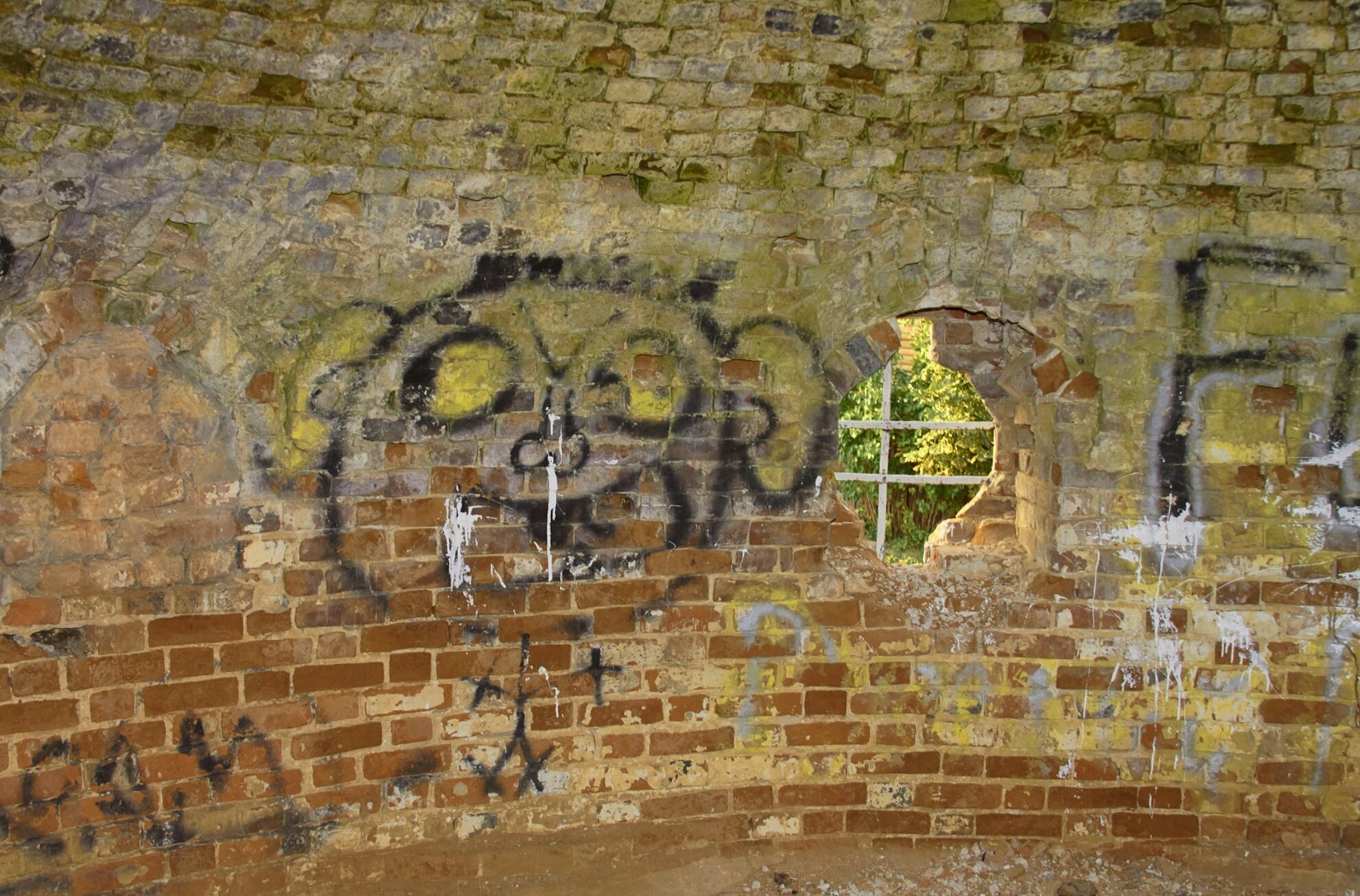 Внутреннее пространство храма являет собой печальное зрелище: кирпичные стены, сложенные из красного кирпича, местами осыпались и несут на себе следы разрушения временем и человеческим небрежением. Особую скорбь вызывает наличие многочисленных граффити, нанесенных чёрной и жёлтой краской поверх святой кладки, что свидетельствует о поругании священного места.
