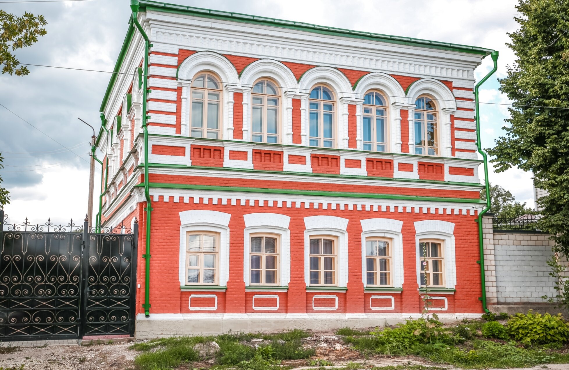На представленной фотографии запечатлен архитектурный облик Успенской церкви города Ельца, являющейся объектом культурного наследия. Здание храма представляет собой двухэтажное кирпичное сооружение, окрашенное в теплый охристый цвет, что характерно для традиционной православной архитектуры региона.