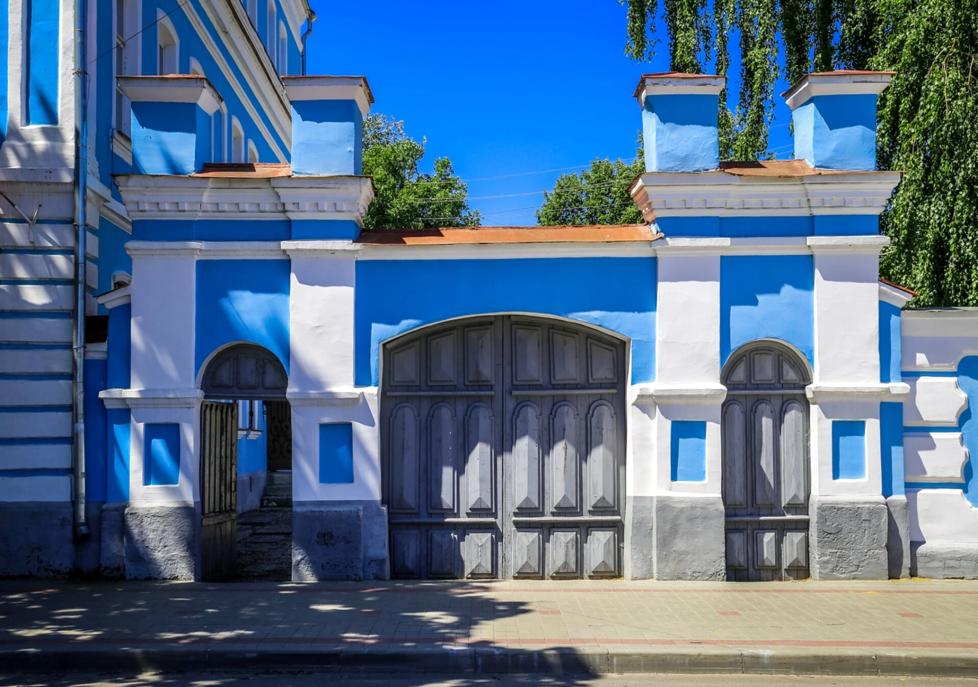 Крыша строения частично покрыта материалами красного и серого цветов, что свидетельствует о разных периодах реставрационных работ. На кровле виднеются дымоходы, характерные для отопительной системы исторических зданий. Окружающая территория включает асфальтированную улицу и зеленые насаждения, среди которых выделяется дерево с пышной кроной, вероятно, береза - традиционное для русских пейзажей дерево.