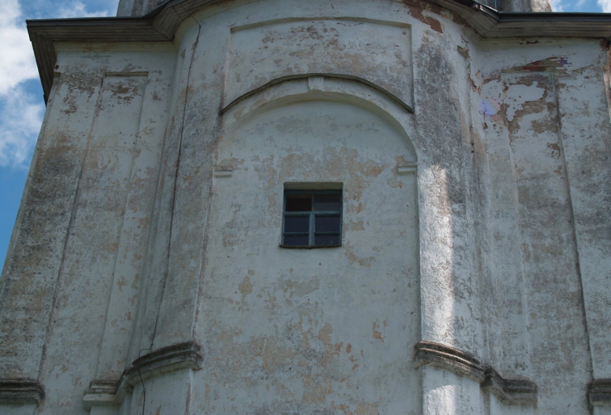 На фотографии запечатлен фрагмент фасада Церкви Успения Пресвятой Богородицы, расположенной в древнем селе Коростынь на берегу озера Ильмень. Этот действующий православный храм является выдающимся памятником архитектуры петровского барокко, единственным образцом данного стиля на Новгородской земле.