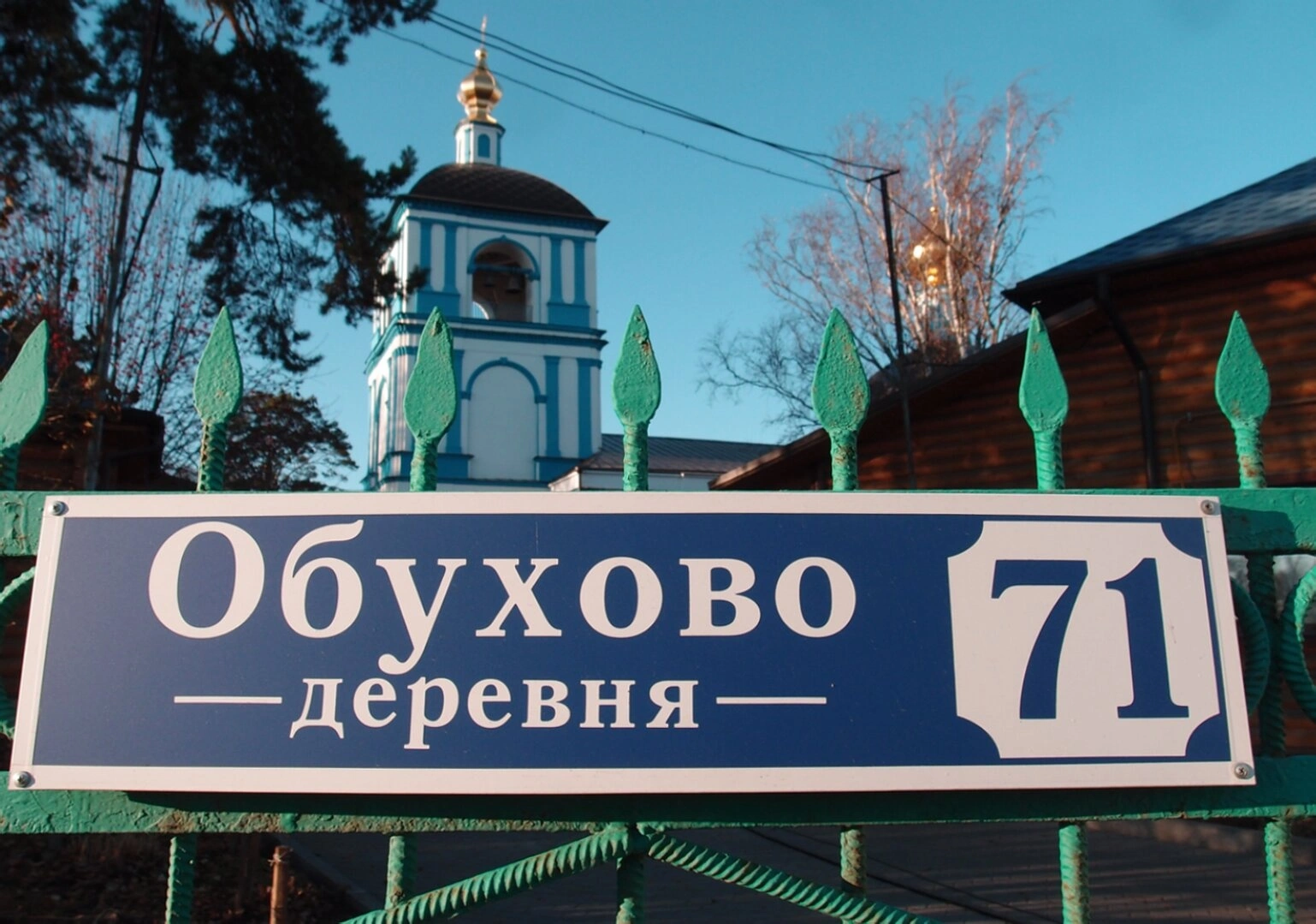На представленной фотографии запечатлён дорожный указатель с надписью «Обухово — деревня —» и номером «71», установленный на металлическом ограждении. На втором плане открывается прекрасный вид на православную святыню — Церковь Успения Пресвятой Богородицы, что в деревне Обухово Московской области. Храм, увенчанный синими куполами с золотыми главками, величественно возвышается на фоне ясного голубого неба, символизируя небесную чистоту и благодать.