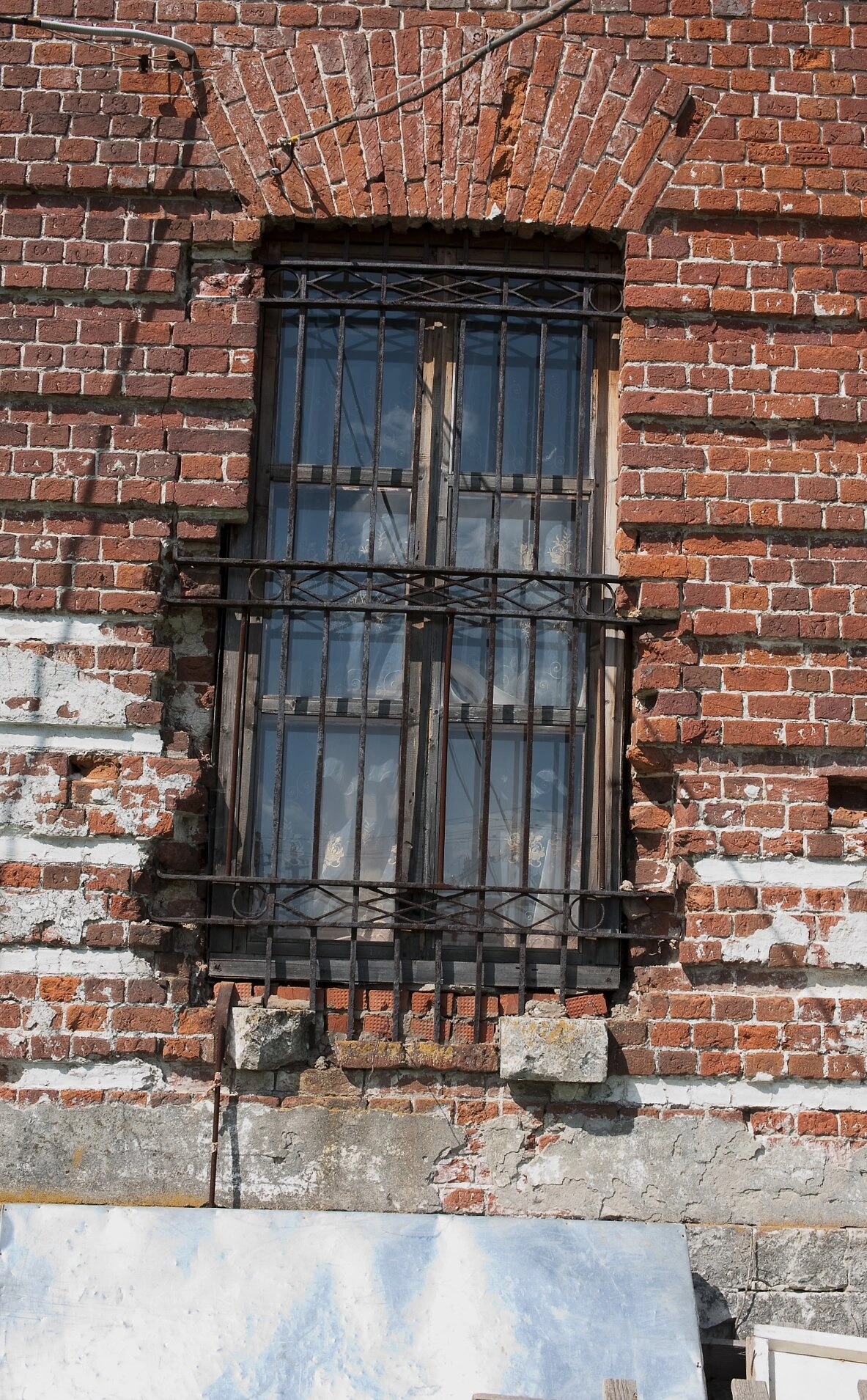 Оконный проем, выполненный в форме арки, характерен для церковной архитектуры и символизирует устремленность к небесному, божественному началу. Металлические решетки, сохранившие свой первоначальный вид, не только выполняют защитную функцию, но и являются произведением кузнечного искусства, подчеркивая сакральный статус здания.