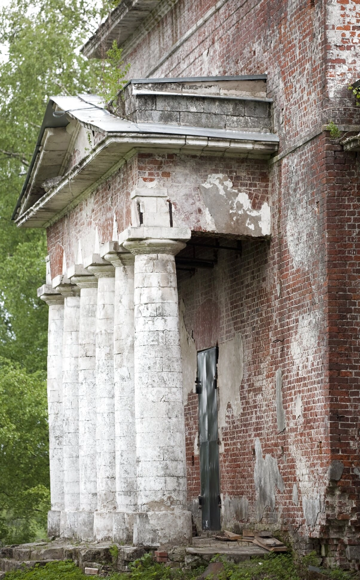 На снимке видно современное состояние храма, требующее реставрационных работ. Часть фасада демонстрирует облупившуюся кирпичную кладку, повреждённую штукатурку и признаки естественного старения архитектурных элементов. Несмотря на это, здание сохраняет своё архитектурное величие и историческую ценность.