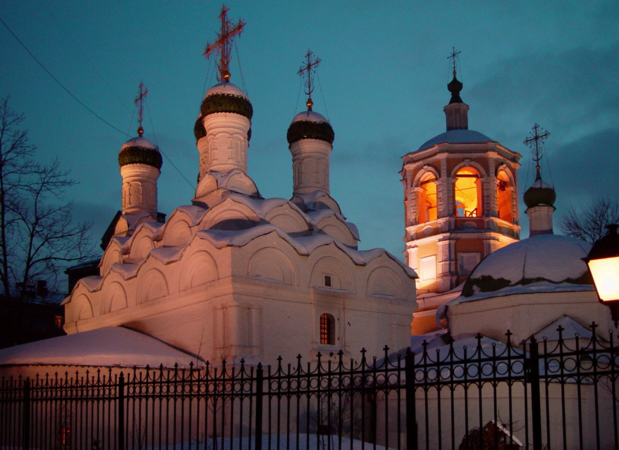 На представленной фотографии запечатлена Церковь Успения Пресвятой Богородицы, что на Успенском Вражке в историческом районе Москвы Путинки. Снимок сделан в зимний вечер, когда первый снег укутал своим белым покровом кровли храма и землю, а тёмное небо подчеркивает благодатное сияние, исходящее из окон церкви и от уличного фонаря, освещающего её святой лик.