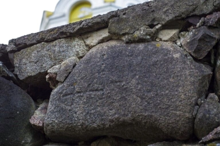 На фотографии запечатлён фрагмент древней каменной кладки стены и часть купола Церкви Успения Пресвятой Богородицы, расположенной в деревне Ручица Зельвенского района Гродненской области. Мощная стена, сложенная из грубого камня, демонстрирует характерный для оборонительного зодчества стиль. Над ней возвышается барабан и зелёный купол, увенчанный православным крестом, символизирующим спасение и искупление.